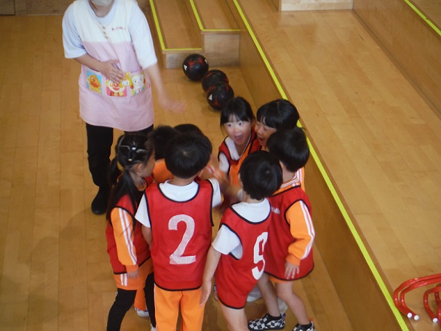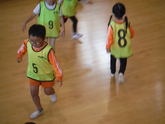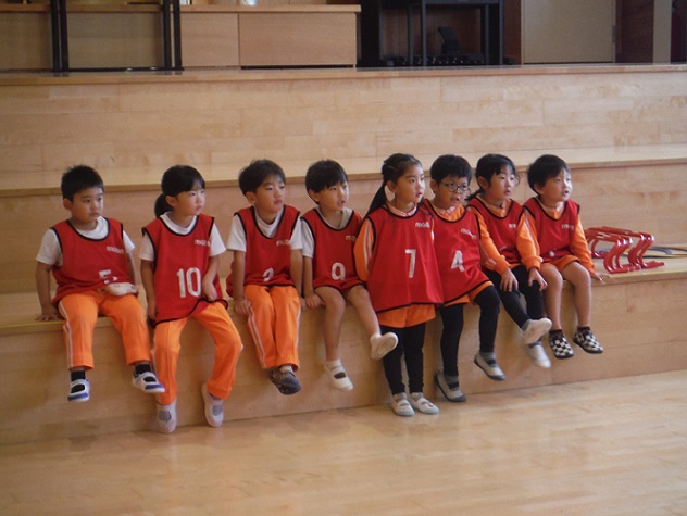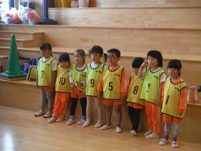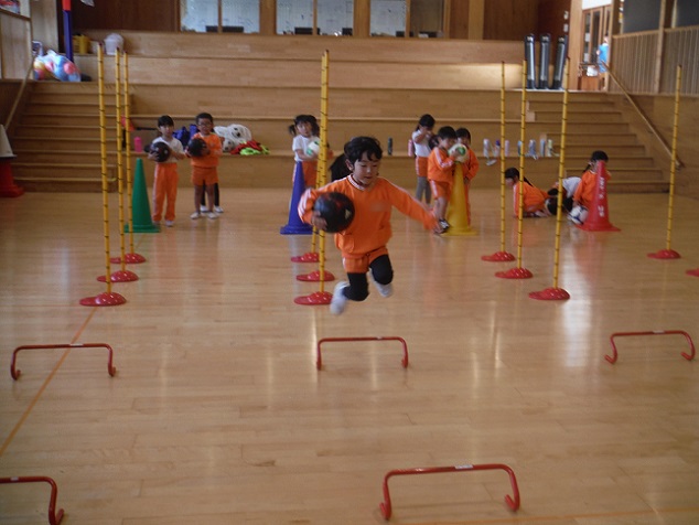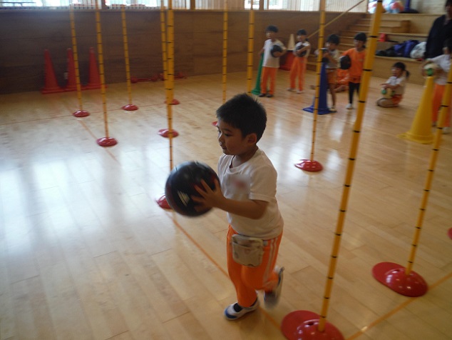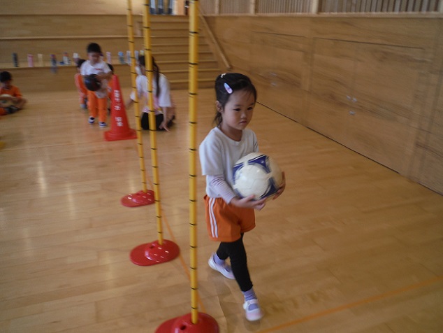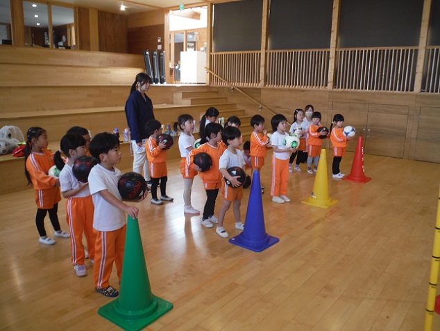 次に4グループに分かれボールを持ち、障害物を通り、最後はコーンにボールを当てて次のお友達にバトンタッチ✋という盛り沢山の内容でしたが、お友達の事を「がんばれ!!」と応援し合う姿もたくさん見られました👀