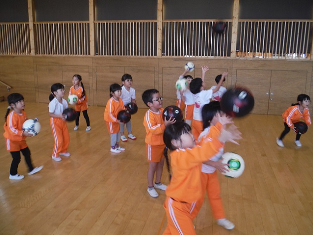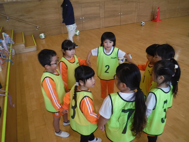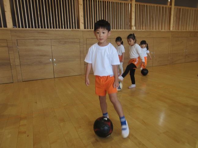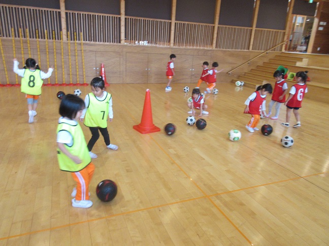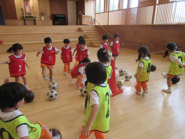 最後に、2チームに分かれて『爆弾ゲーム』(相手の陣地にボールを蹴り、自分の陣地のボールが少ない方が勝利)という名のお友だちとの協力ゲームを楽しみました⚽♪