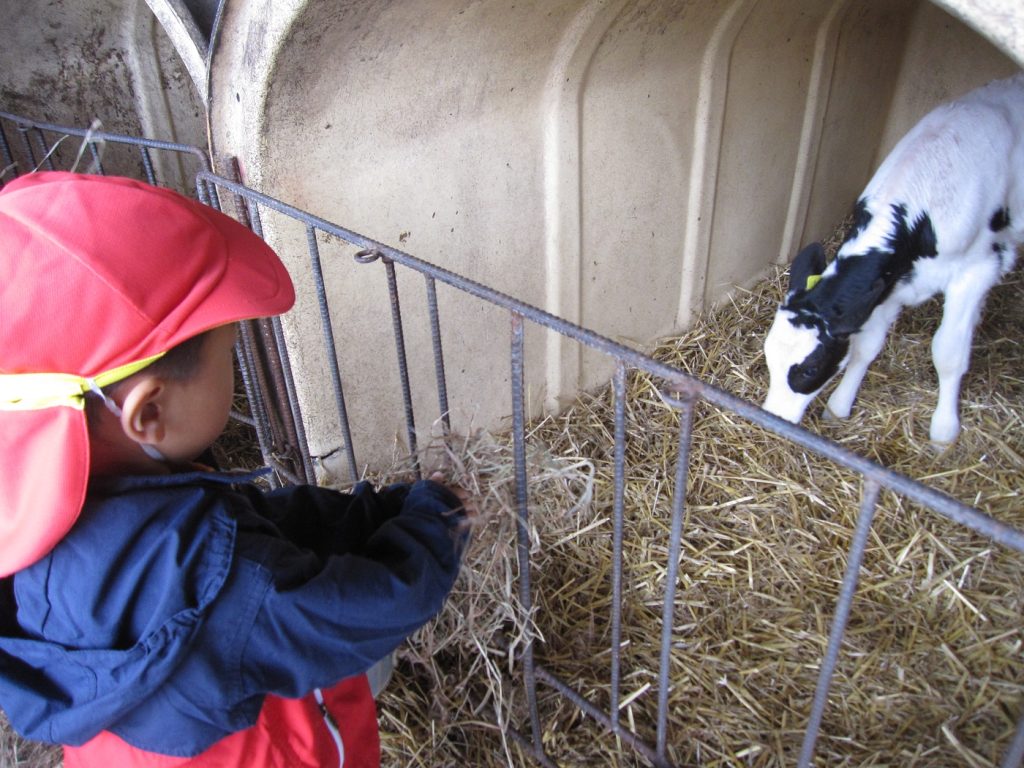 「大きい~」と子牛との大きさの違いにびっくりの子どもたち!