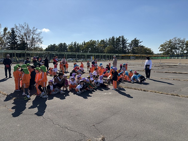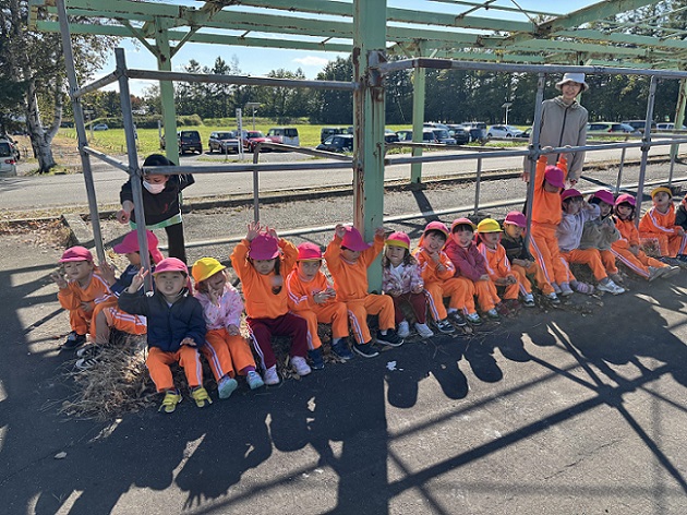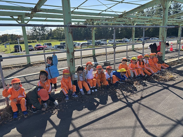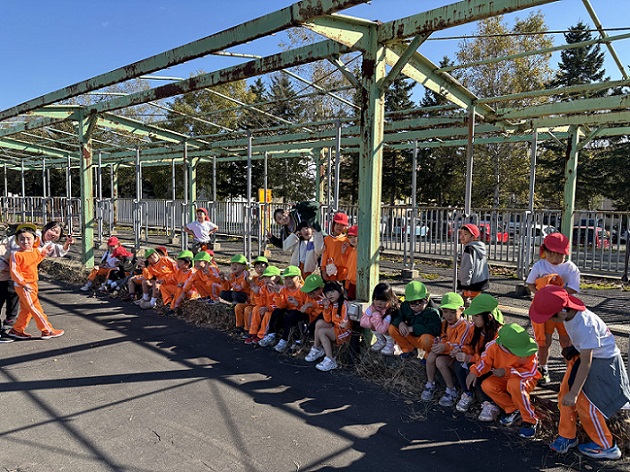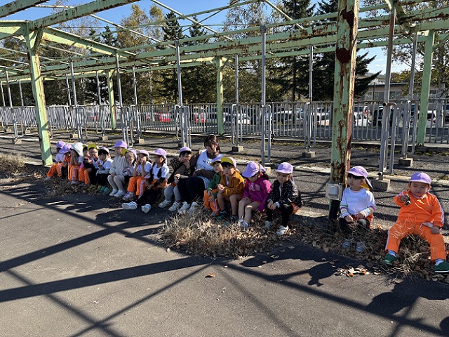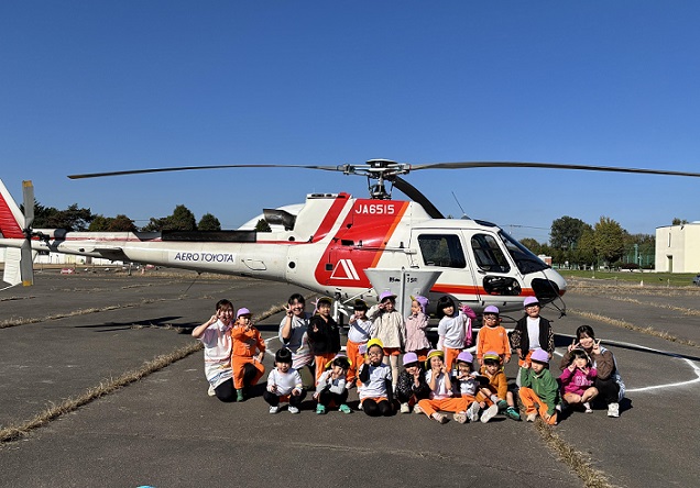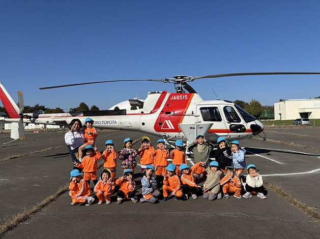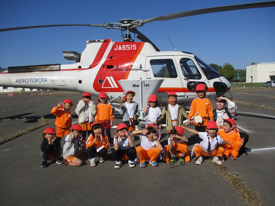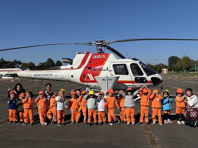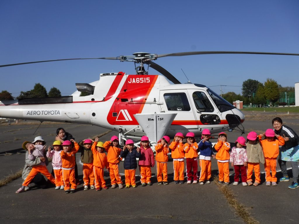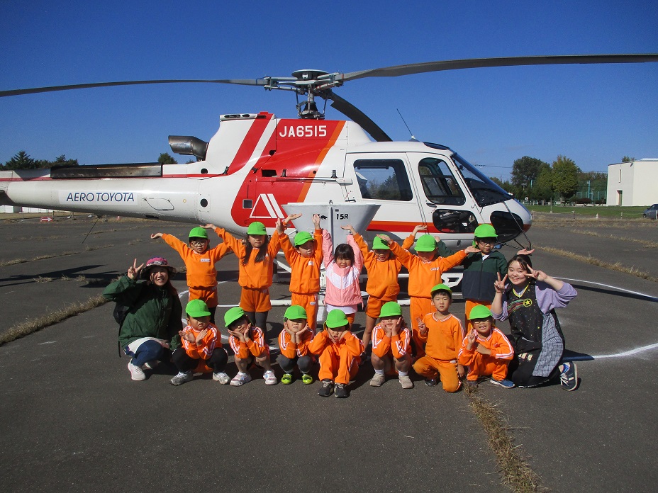 10月14日(火)、外からヘリコプターの音が聞こえ、帯広大谷短期大学の北側駐車場に降り立ったヘリコプターを給食後に、急遽全園児で見に行く事になりました☺