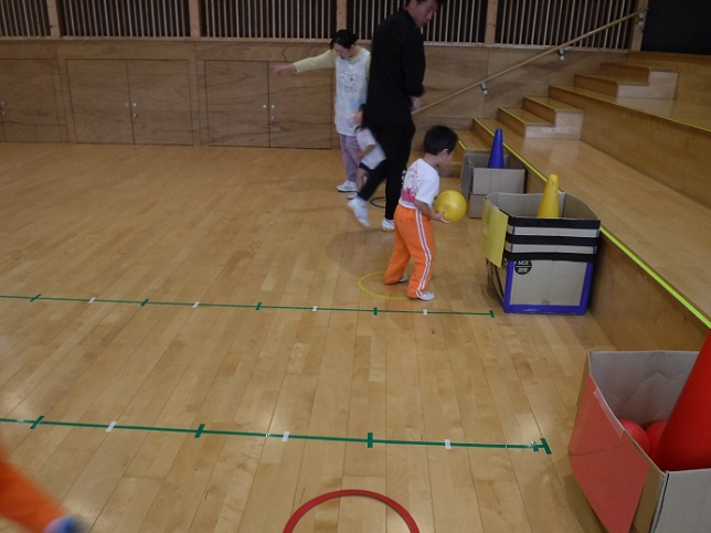 ボールを持ったまま輪っかの中をジャンプしたり、棒の下をくぐったあと、箱の中にポーン!と投げ入れましたよ⚽