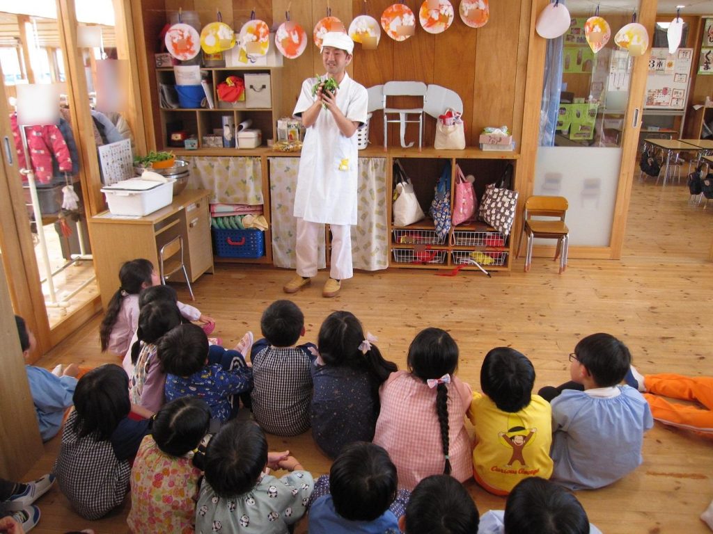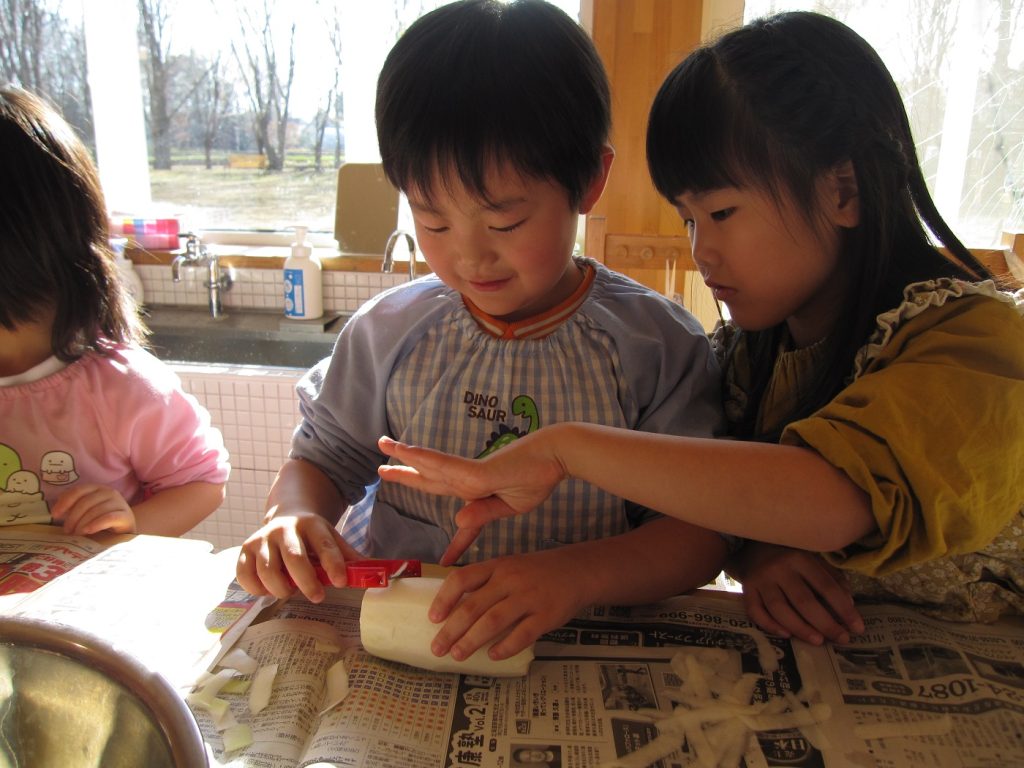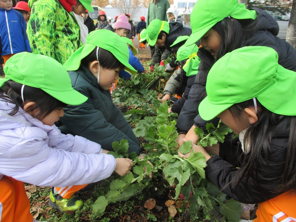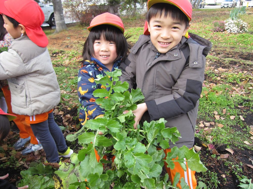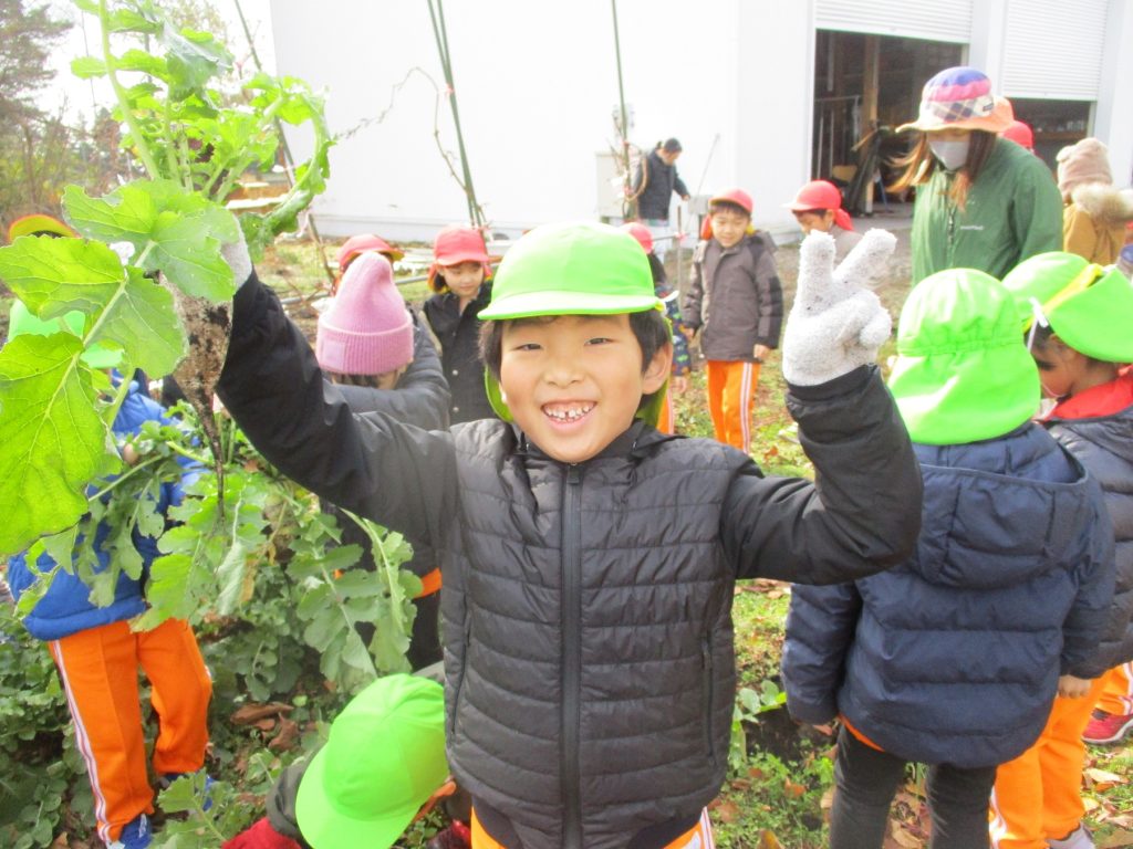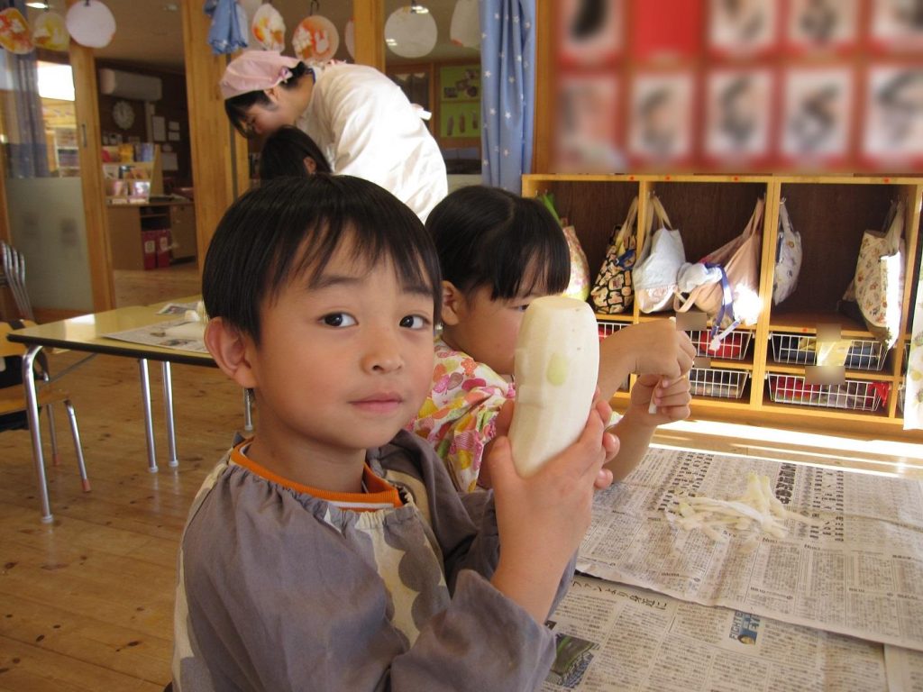 大根の根っこの部分は大根おろしにするとおいしいと教えてもらい、「へ~~」と真剣に聞いていた子どもたち!大根おろしを辛くならないようにするためには優しくゆっくりすりおろすと辛み成分が出てこないということを教えてもらい、「お家に帰ったら教えてあげよ~」と言っているお友だちもいました✨