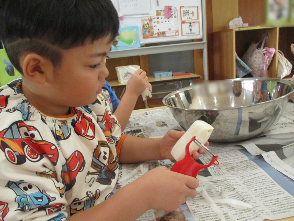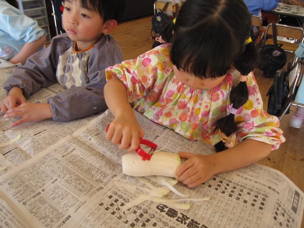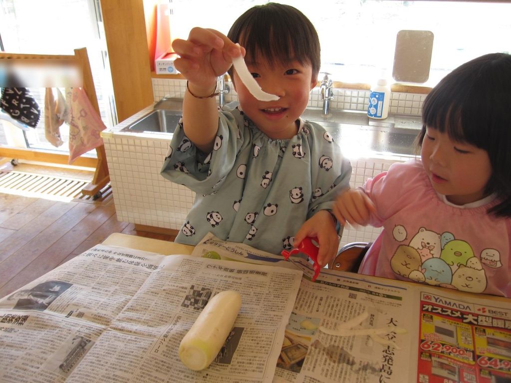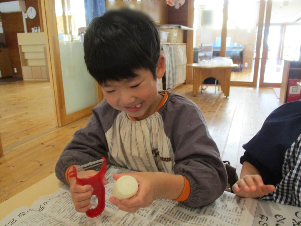お話後さっそく、大根の皮むきに挑戦!ピーラーを使って皮をむきましたよ(^^)