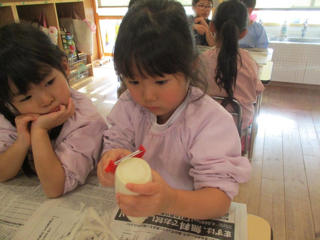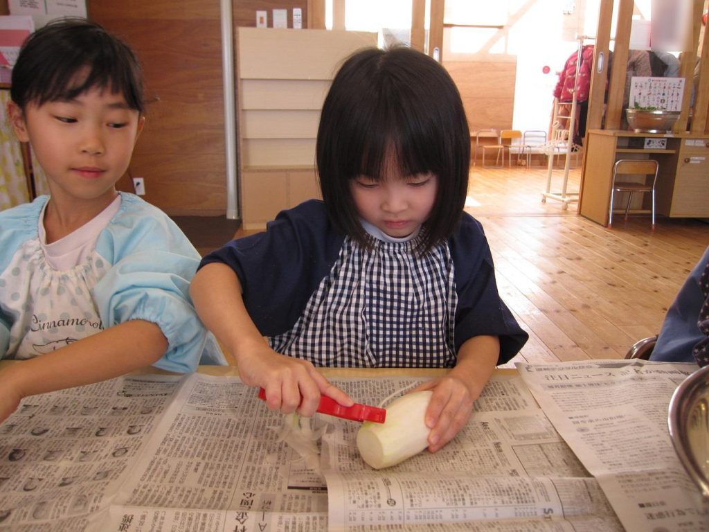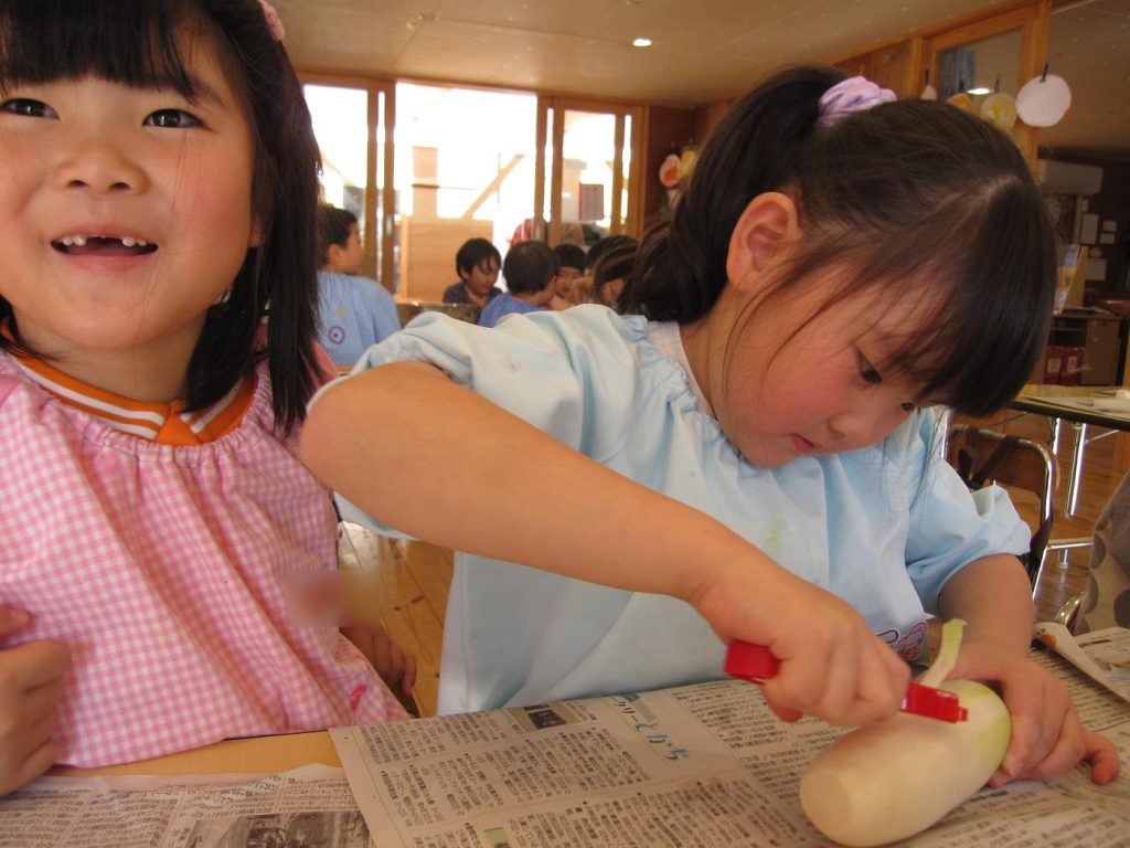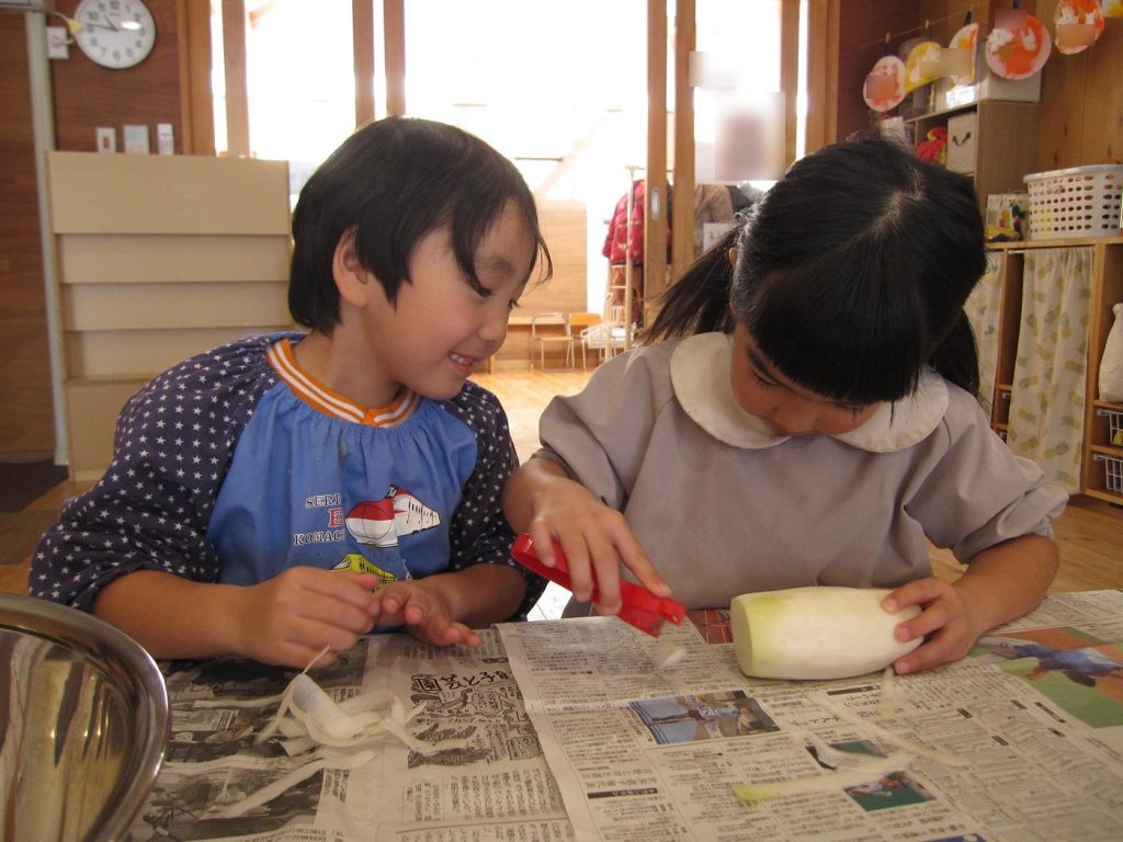 お話後さっそく、大根の皮むきに挑戦!ピーラーを使って皮をむきましたよ(^^)