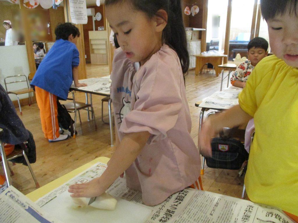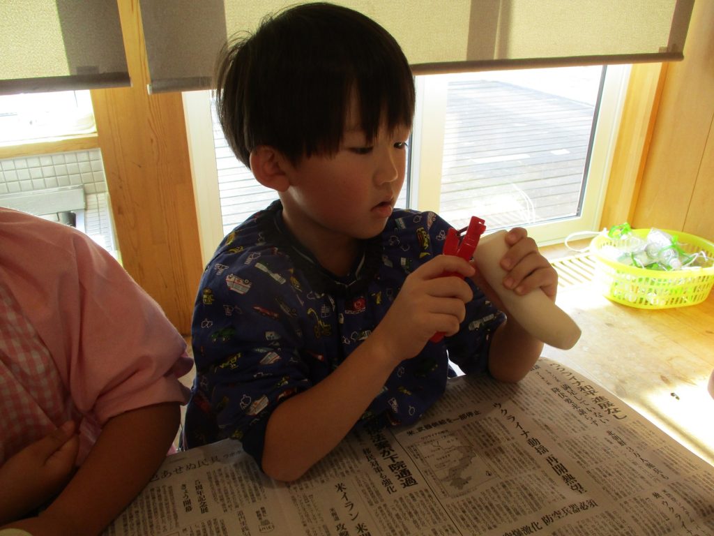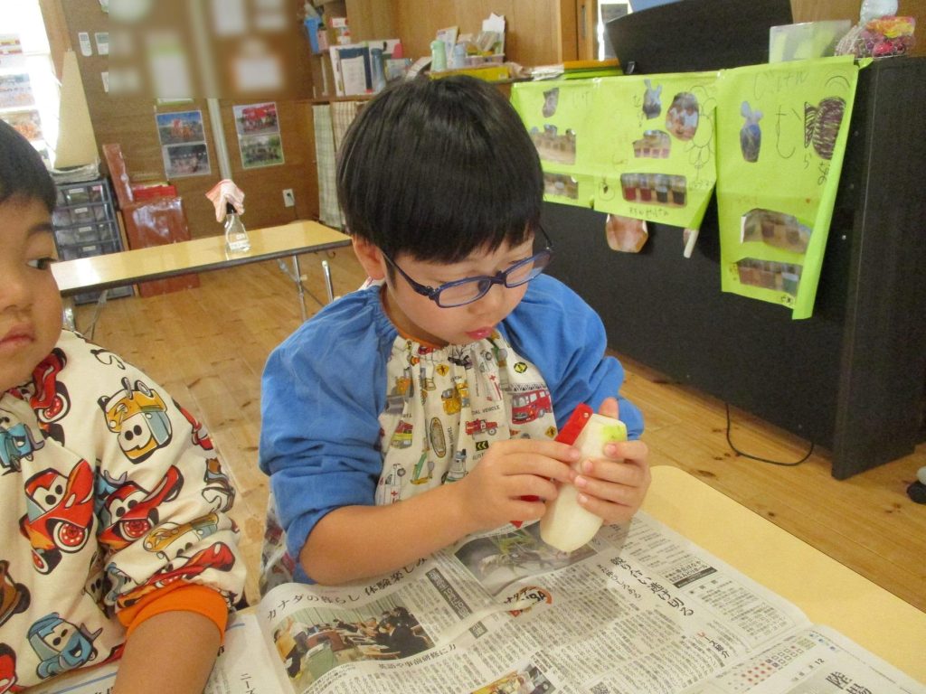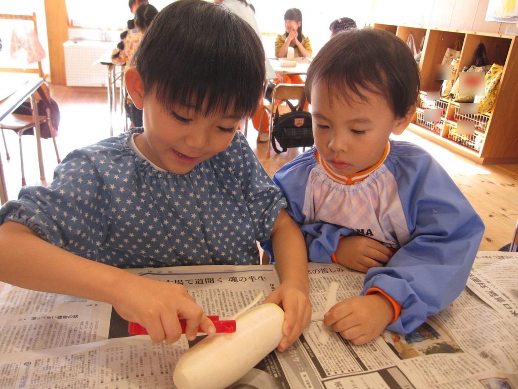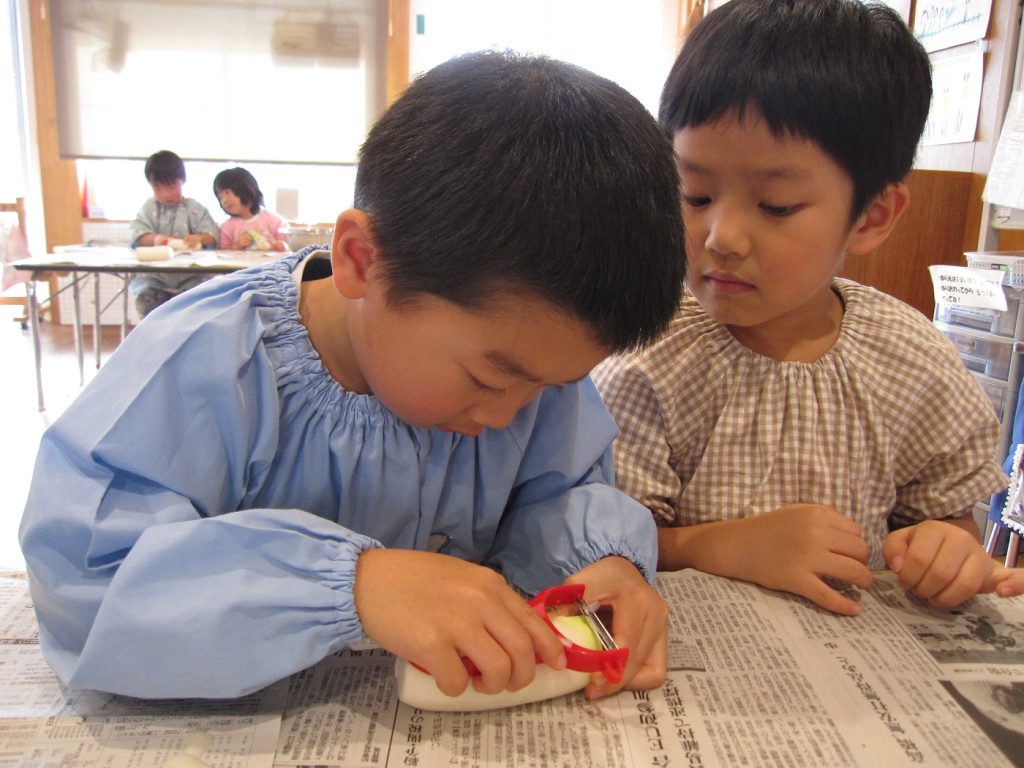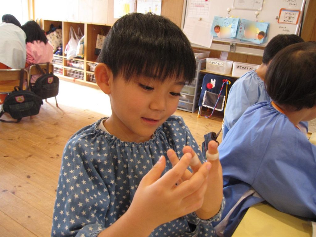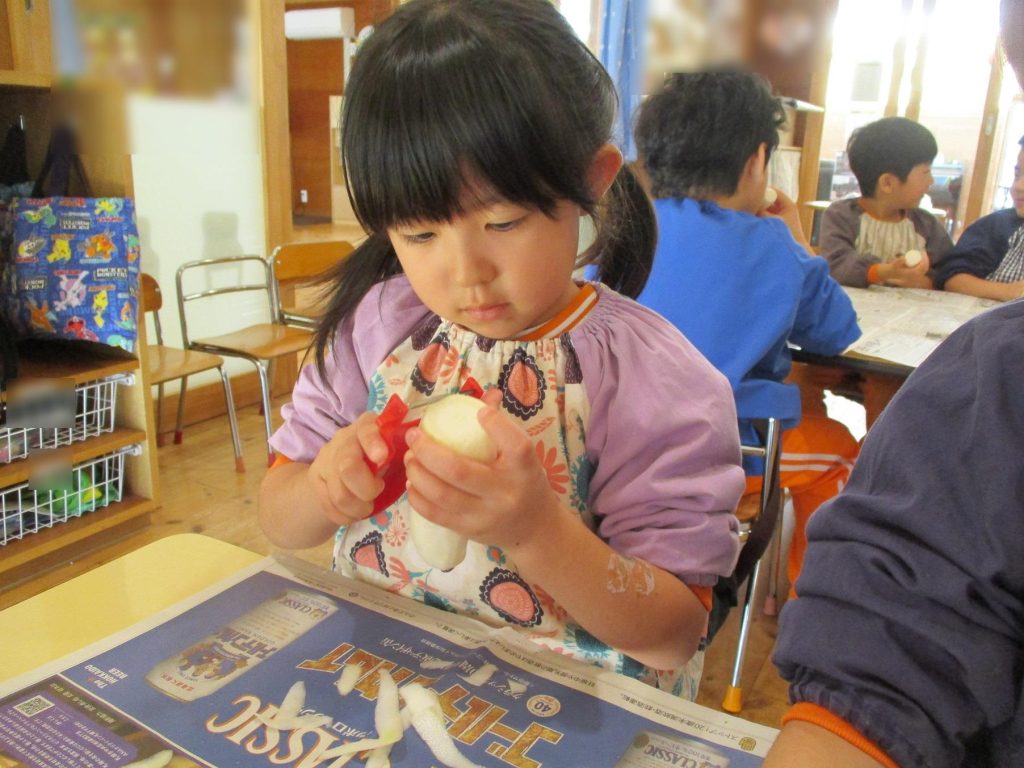 順番に行ったので待っている間、「早くやりたーい!」と皮で顔を作ったり皮を絆創膏に見立てて指に巻いたりして順番を待っていた子どもたちです(^^♪