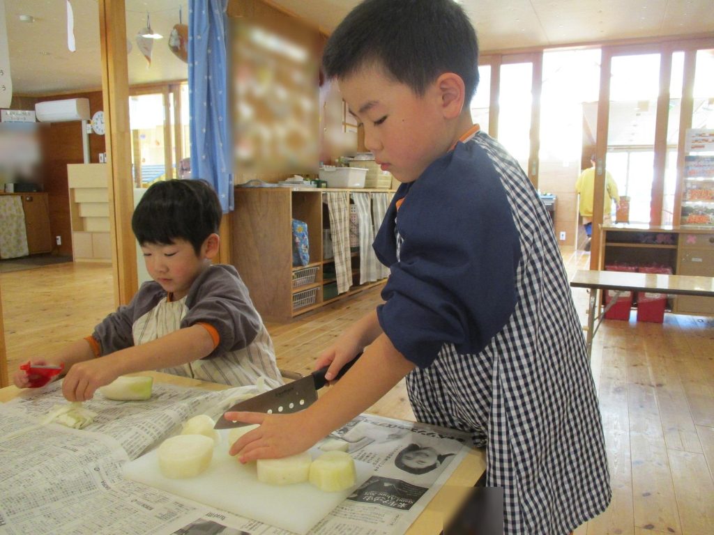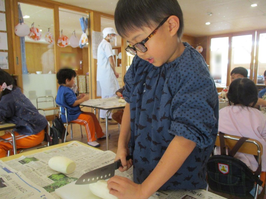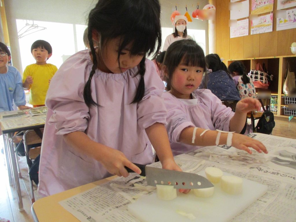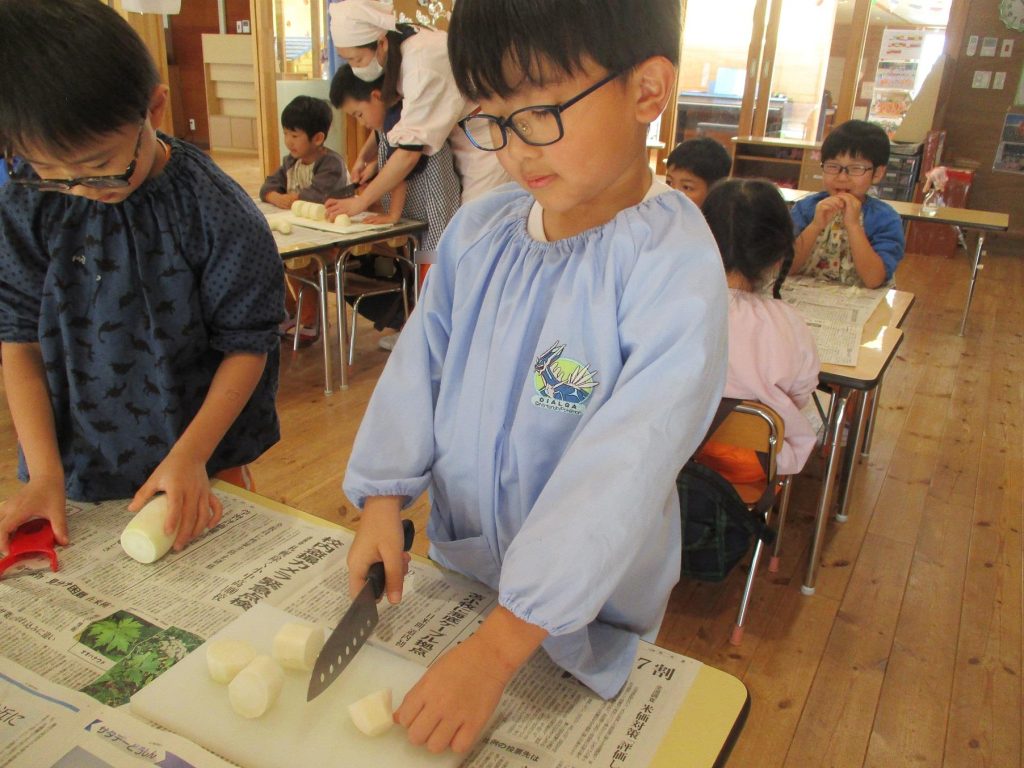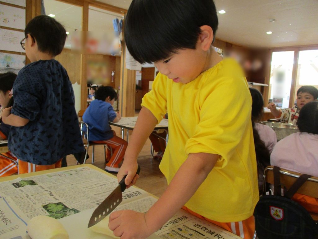 輪切りにした後、隠し包丁に挑戦しましたよ✨真剣な表情で包丁を使っていた年長さんです!