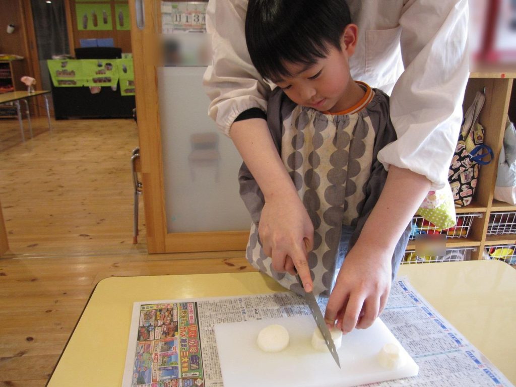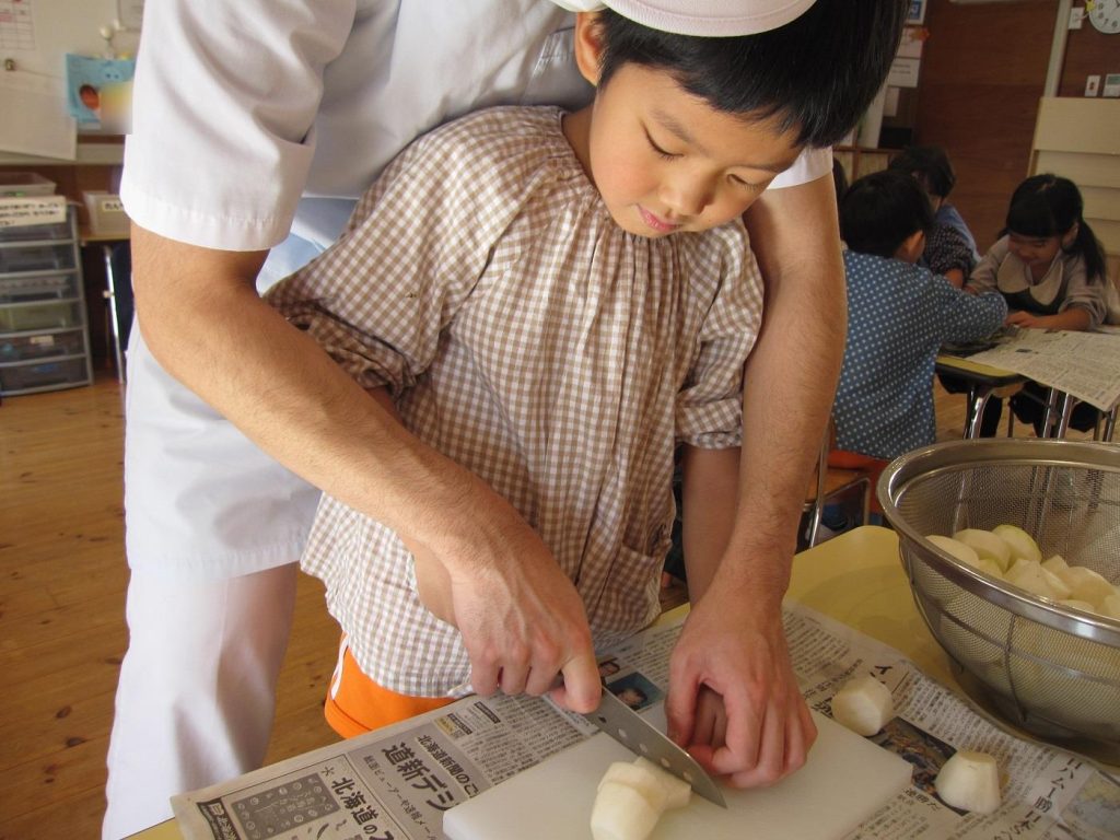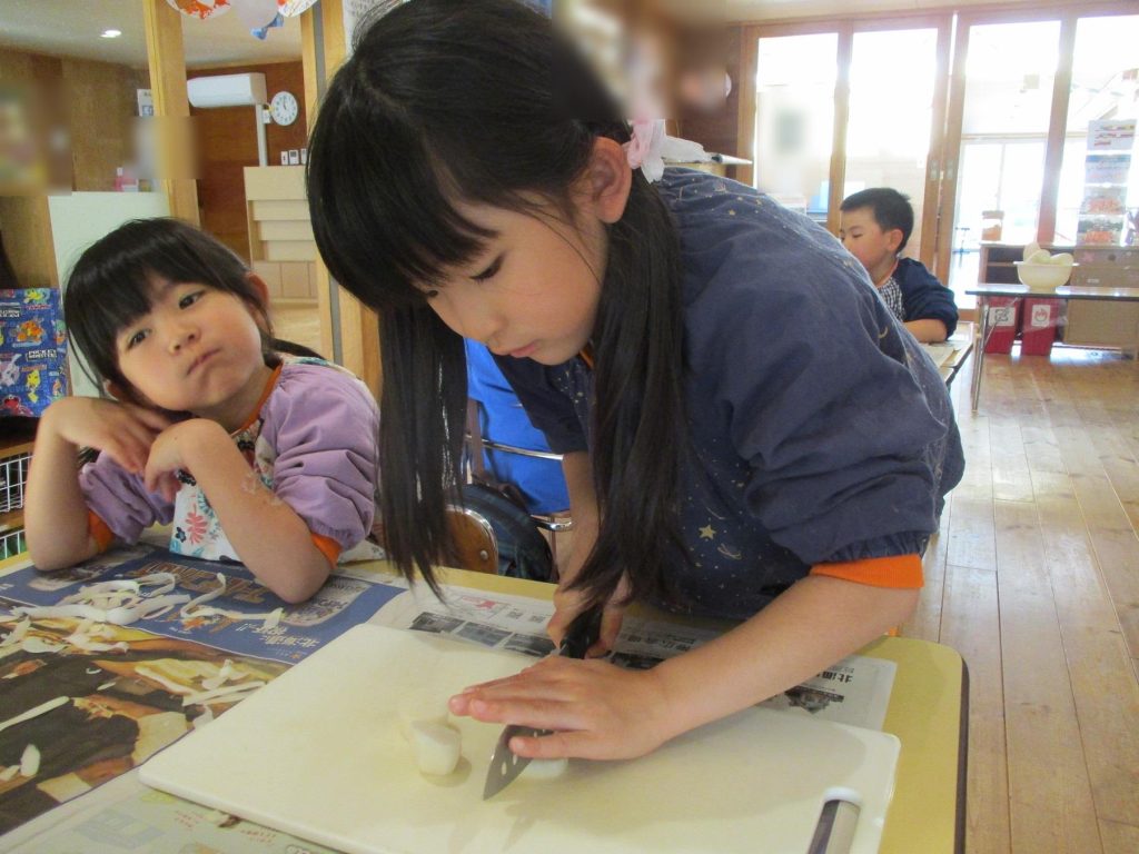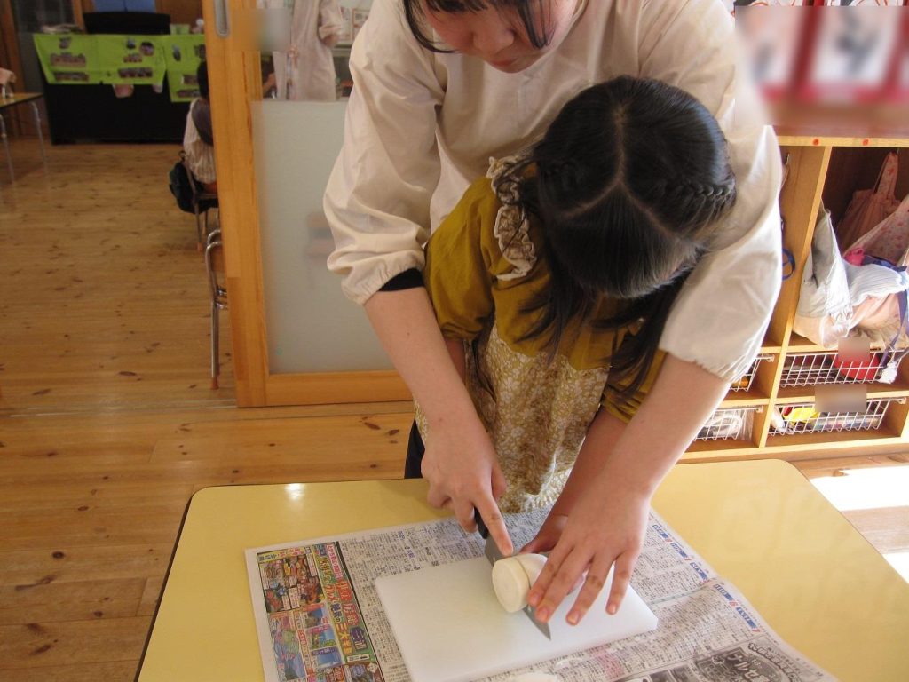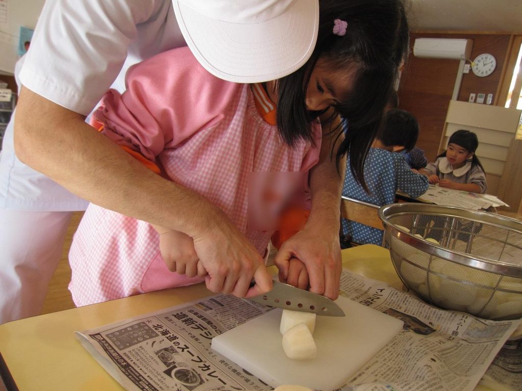 輪切りにした後、隠し包丁に挑戦しましたよ✨真剣な表情で包丁を使っていた年長さんです!