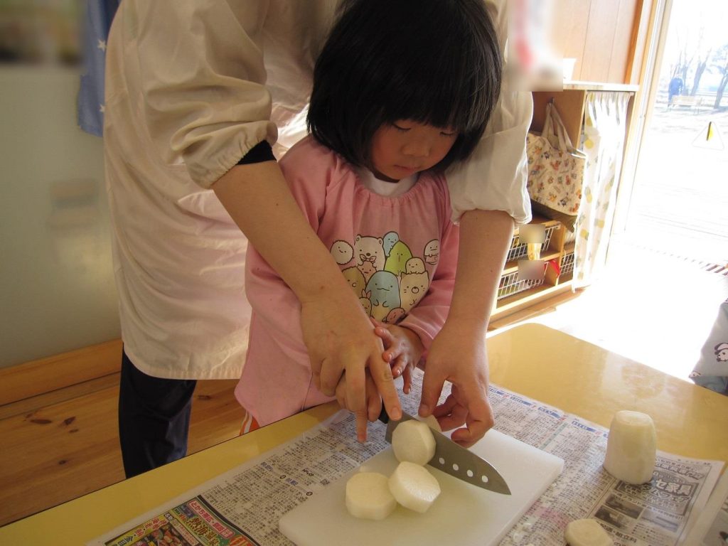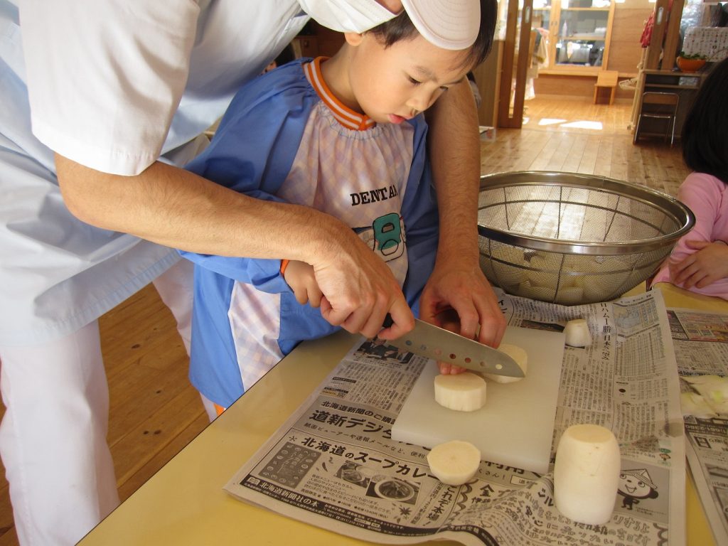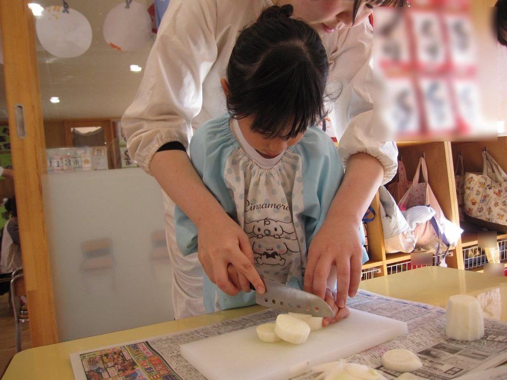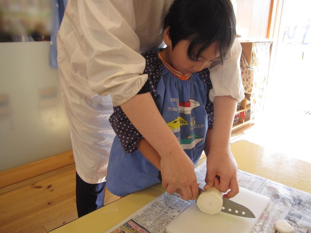 皮をむき終わった後、先生やゆっきーさんと大根を輪切りにしましたよ!ねこの手にして切っていました😊