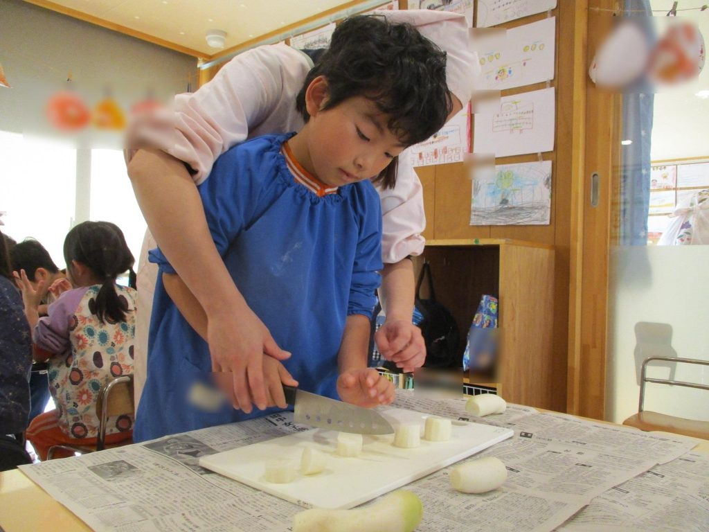 11月13日(木)に大根を使ってクッキングを行いました!自分たちで植えた大根を使用して行いましたよ!