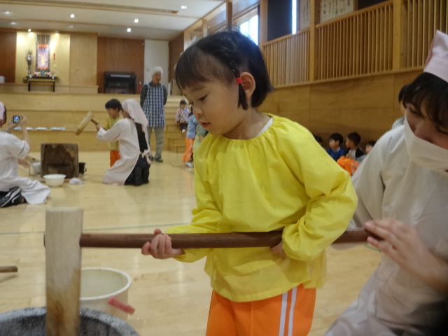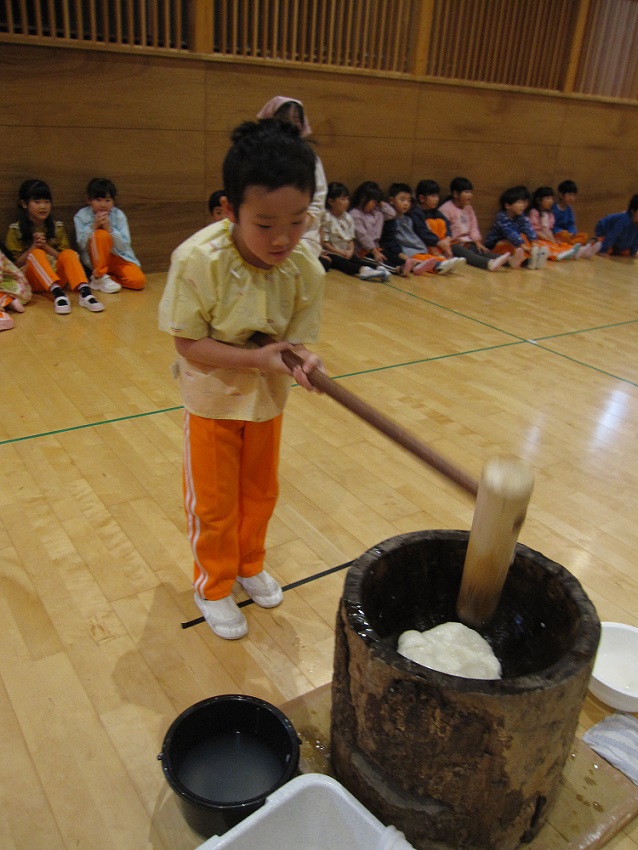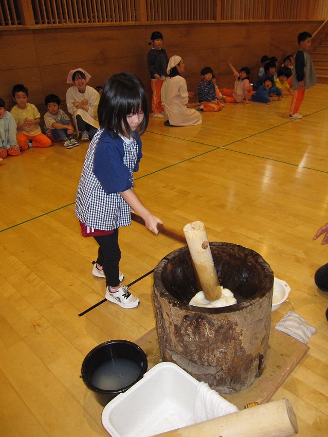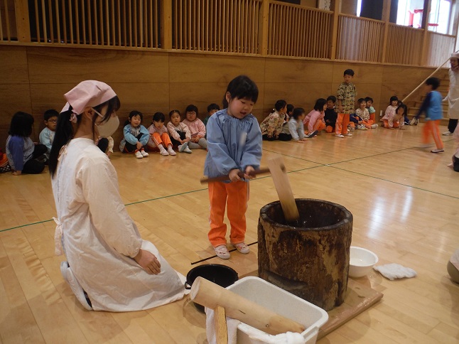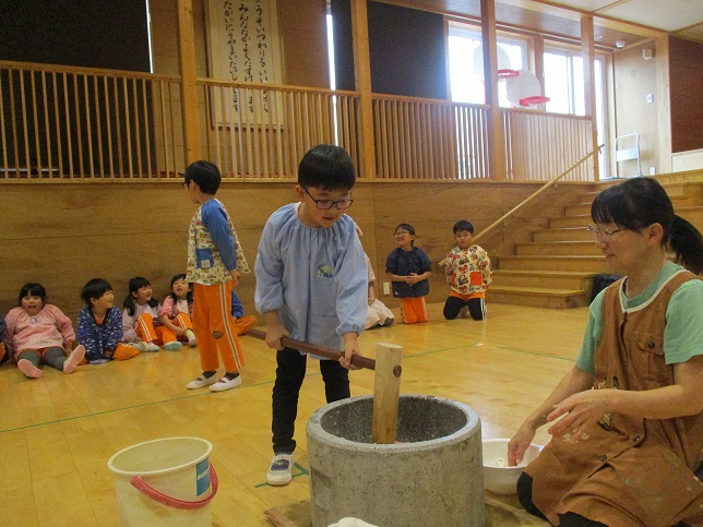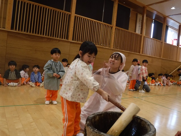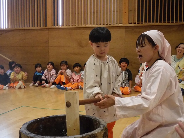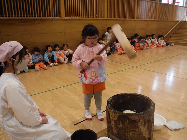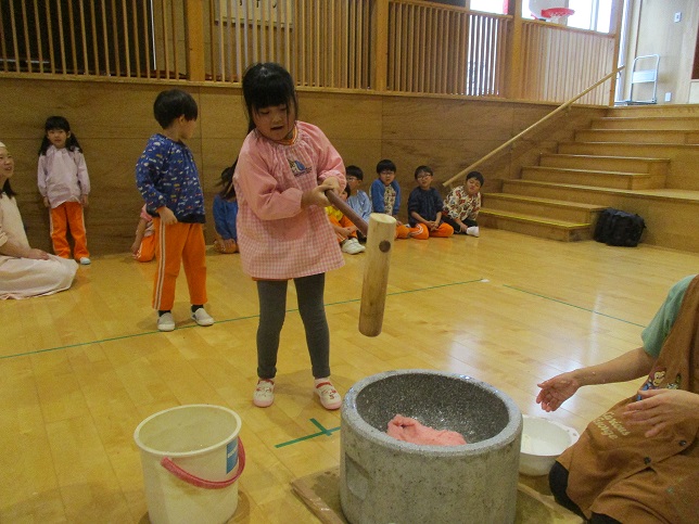年長さんは1人10回ずつ、おもちをつきましたよ!とても力強くおもちをつくことが出来ました✨