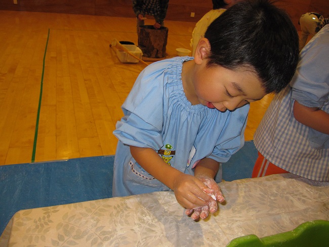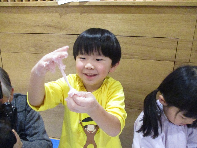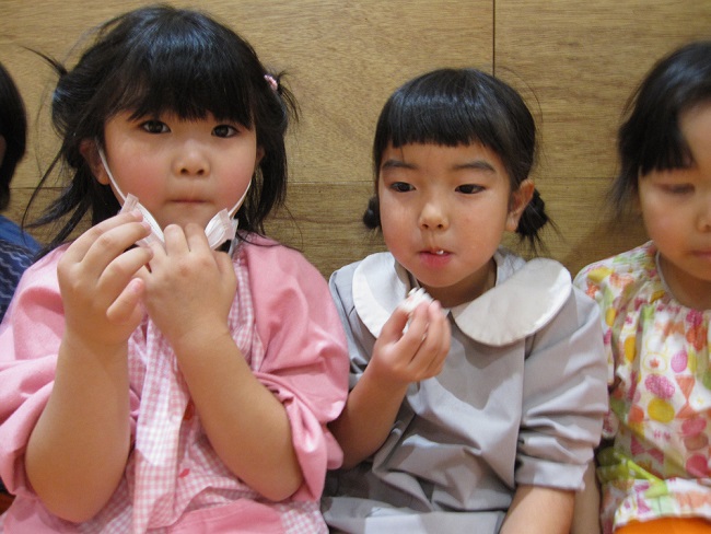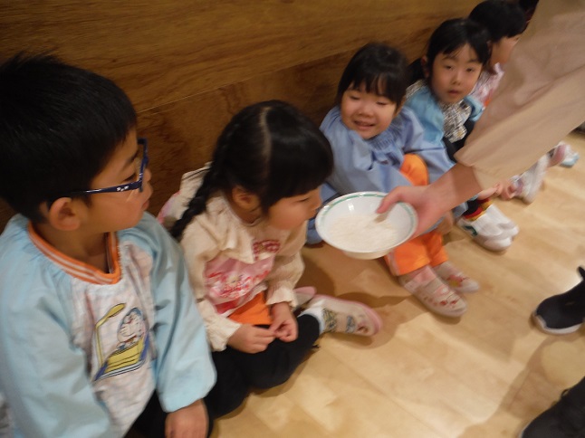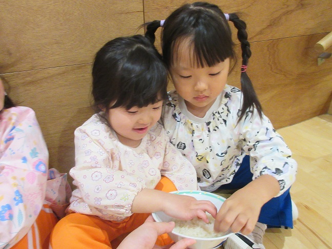 まずは、蒸す前のもち米を触ったり、蒸らしたもち米の匂いを嗅いだり、味見するなど普段食べてるお米ともち米の違いを感じました。食べた瞬間に「もちもちしてる!」と大興奮の子どもたちでした♪