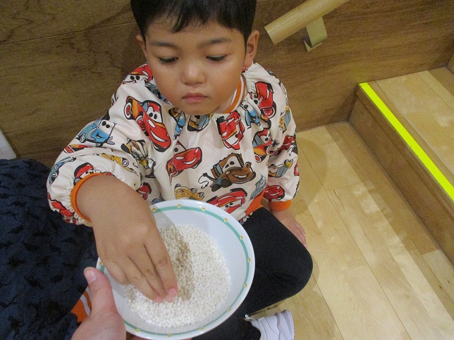 年中さんもまずは蒸す前のもち米を触ってみたり、匂いを嗅いでみたり…