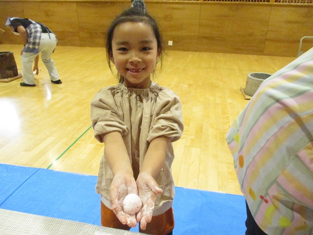 その後に1人5回ずつ力いっぱい、おもちをつきました!