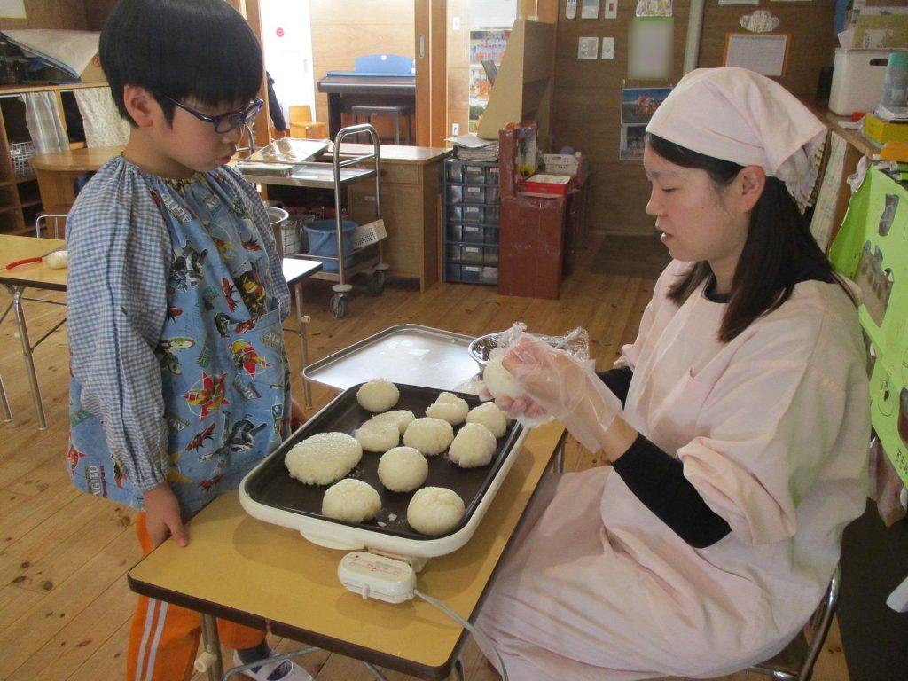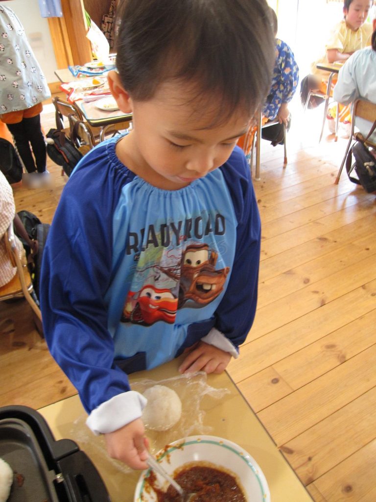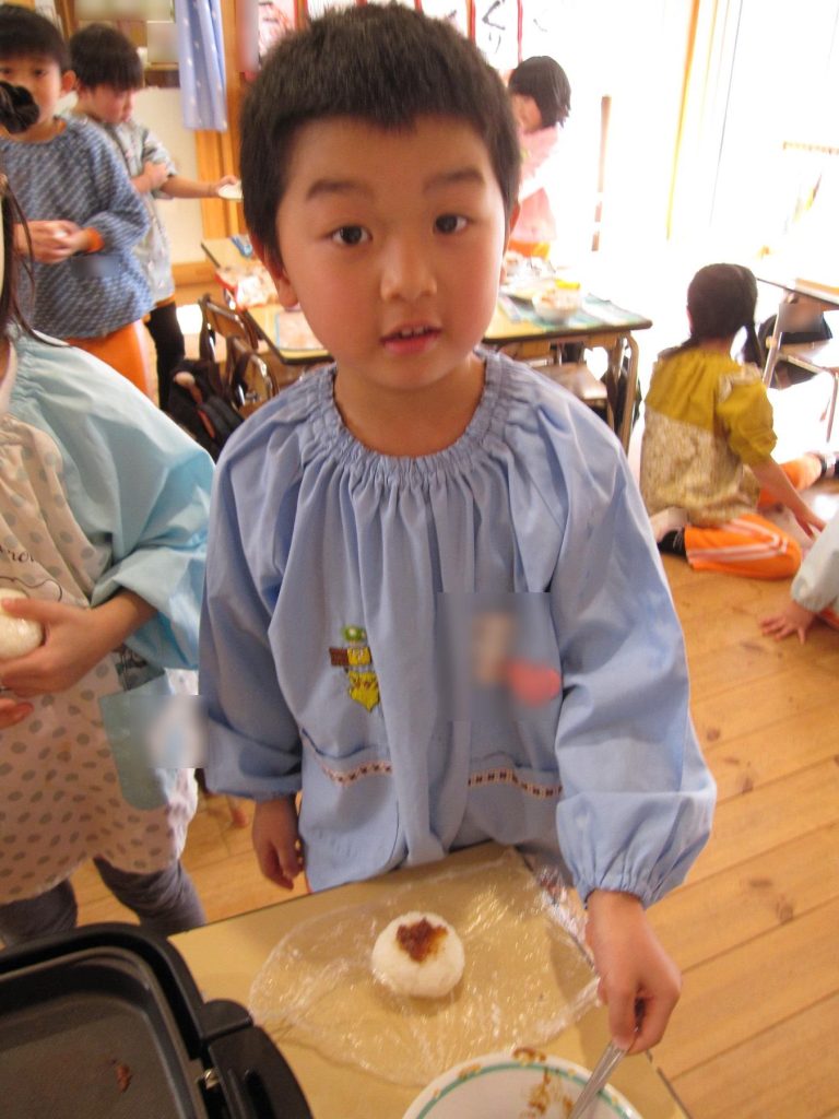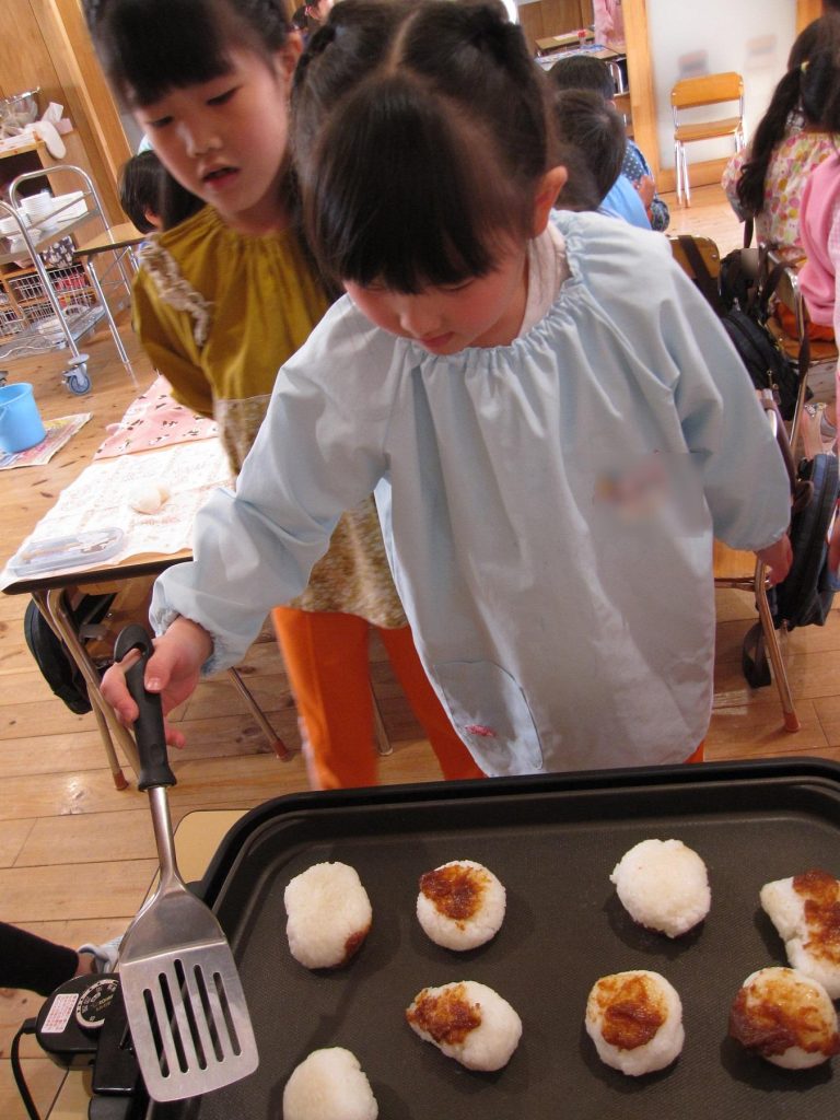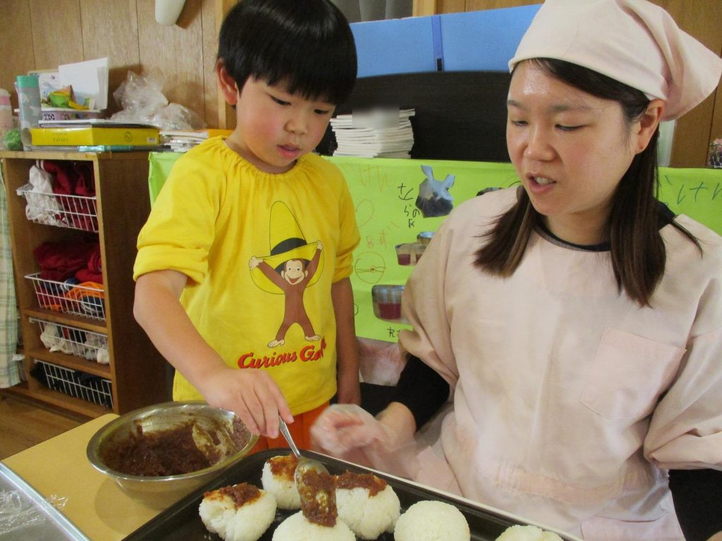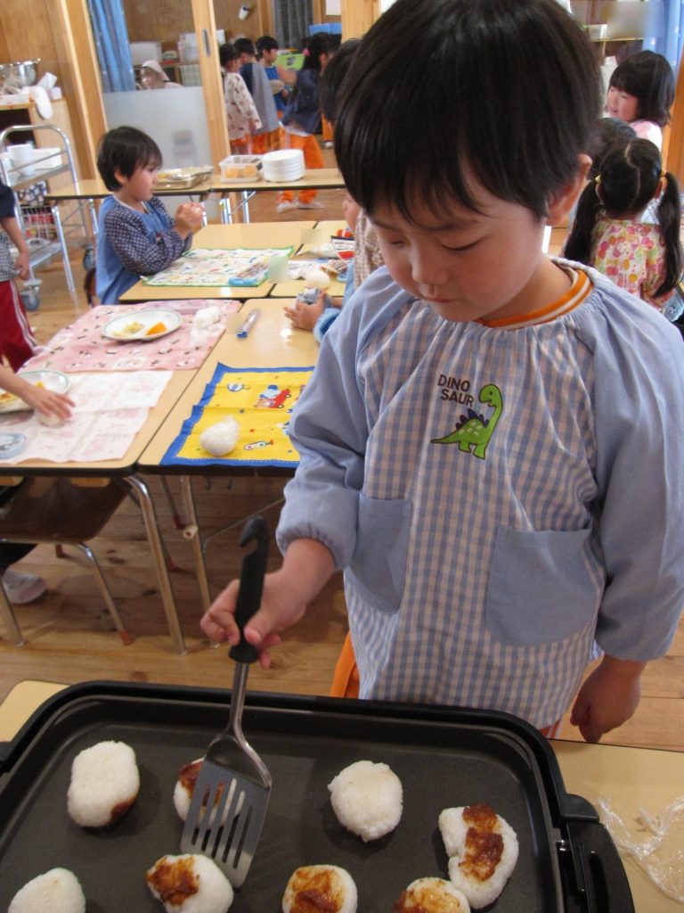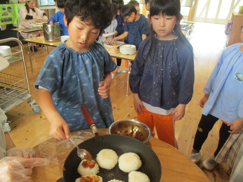 おにぎり作りは、お手の物✨な、年長さん!今回は、昨年みんなで作った、幼稚園の味噌を使って、味噌焼きおにぎりを作りましたよ~。