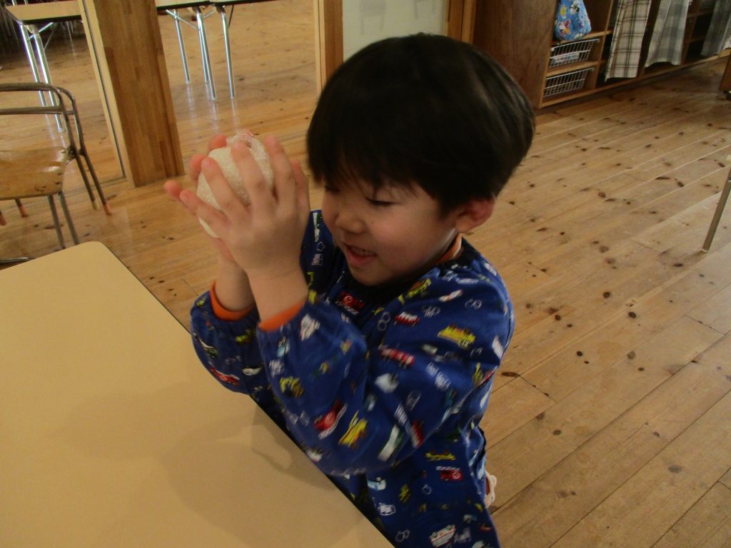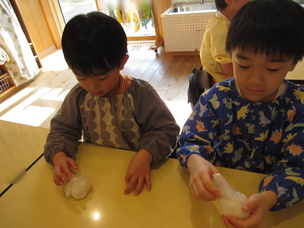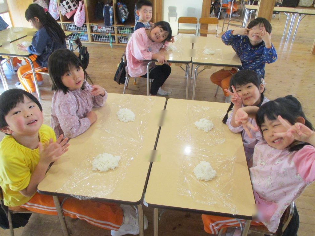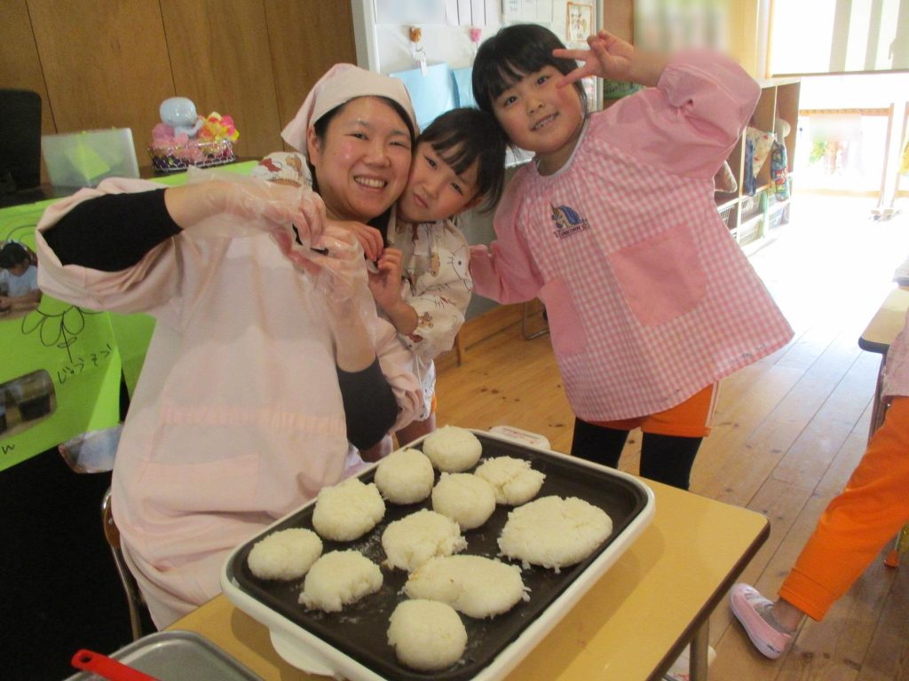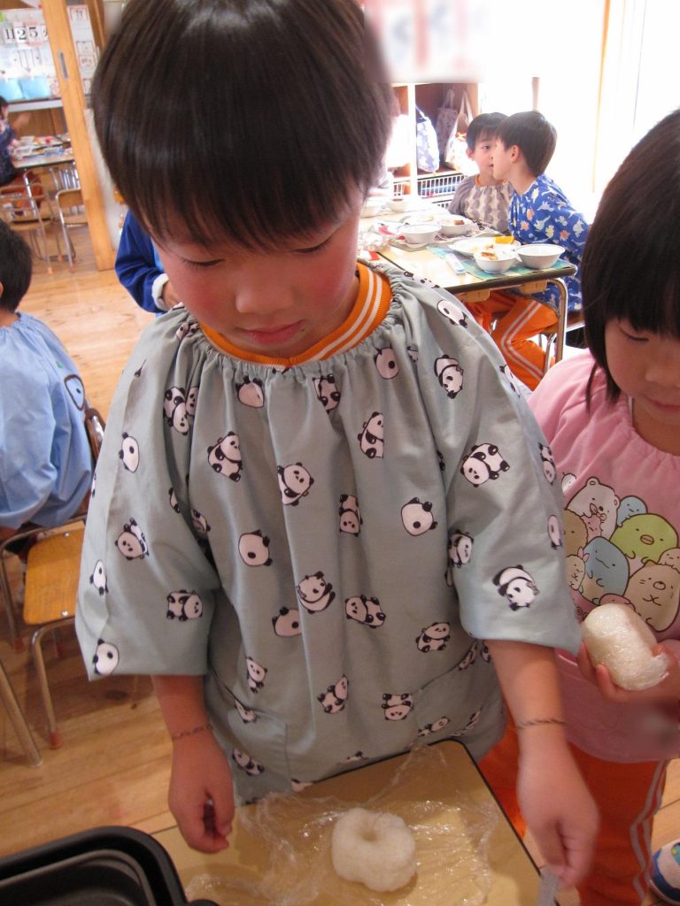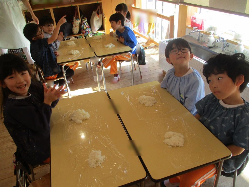 おにぎり作りは、お手の物✨な、年長さん!今回は、昨年みんなで作った、幼稚園の味噌を使って、味噌焼きおにぎりを作りましたよ~。