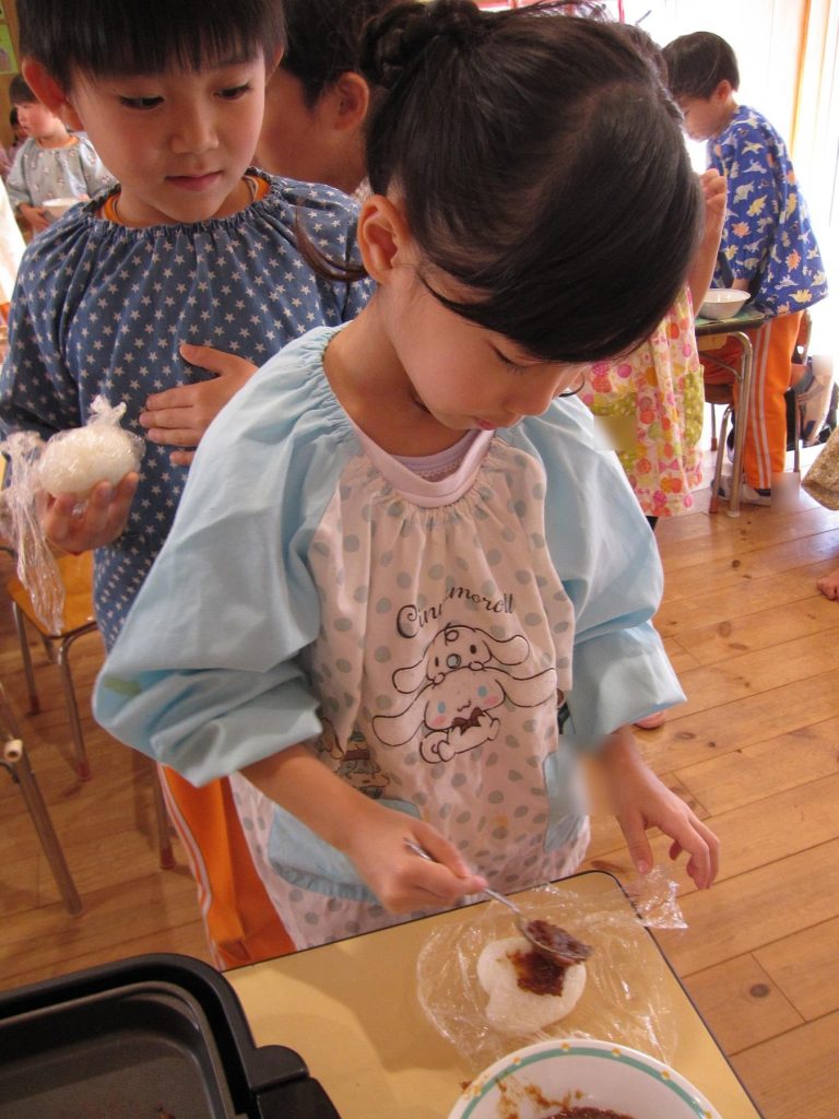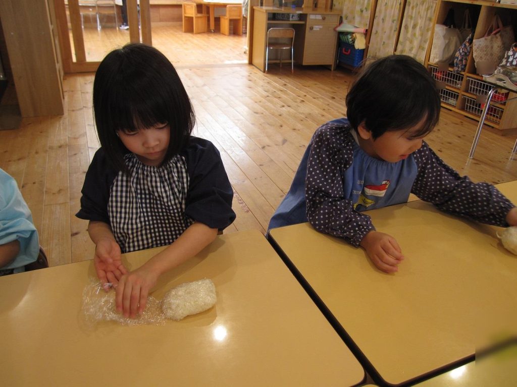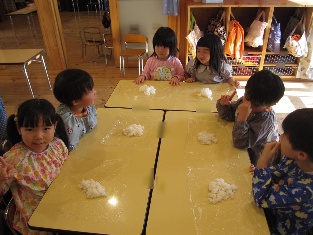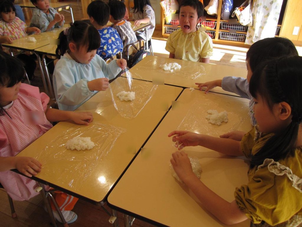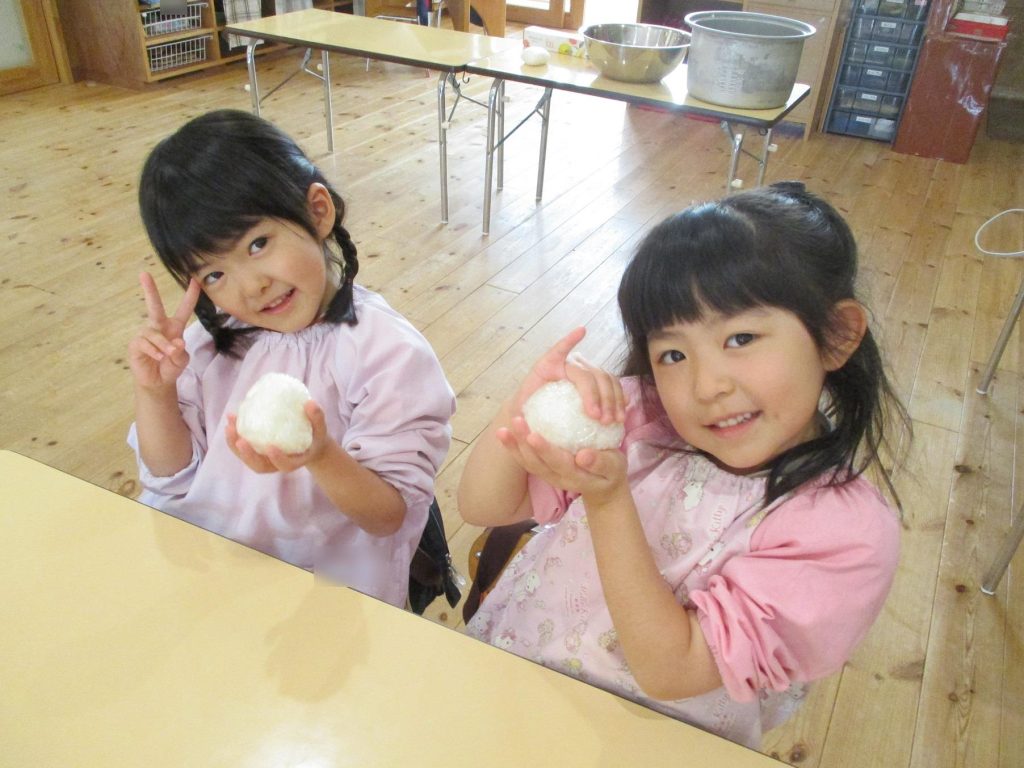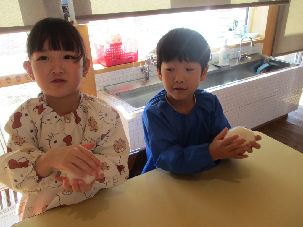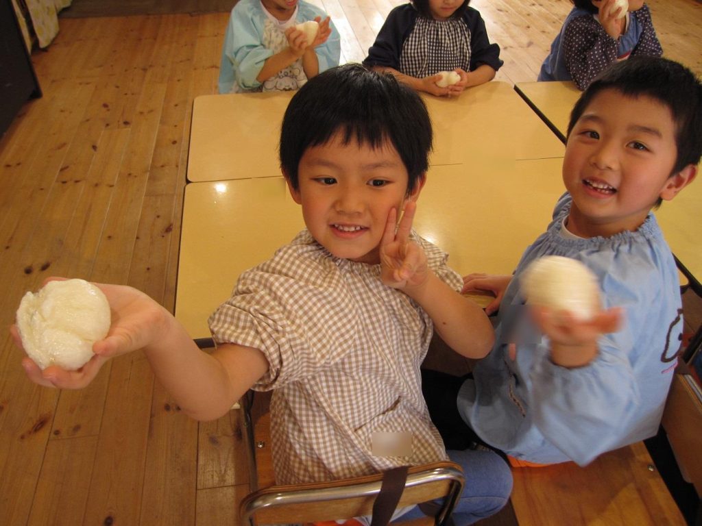 おにぎり作りは、お手の物✨な、年長さん!今回は、昨年みんなで作った、幼稚園の味噌を使って、味噌焼きおにぎりを作りましたよ~。