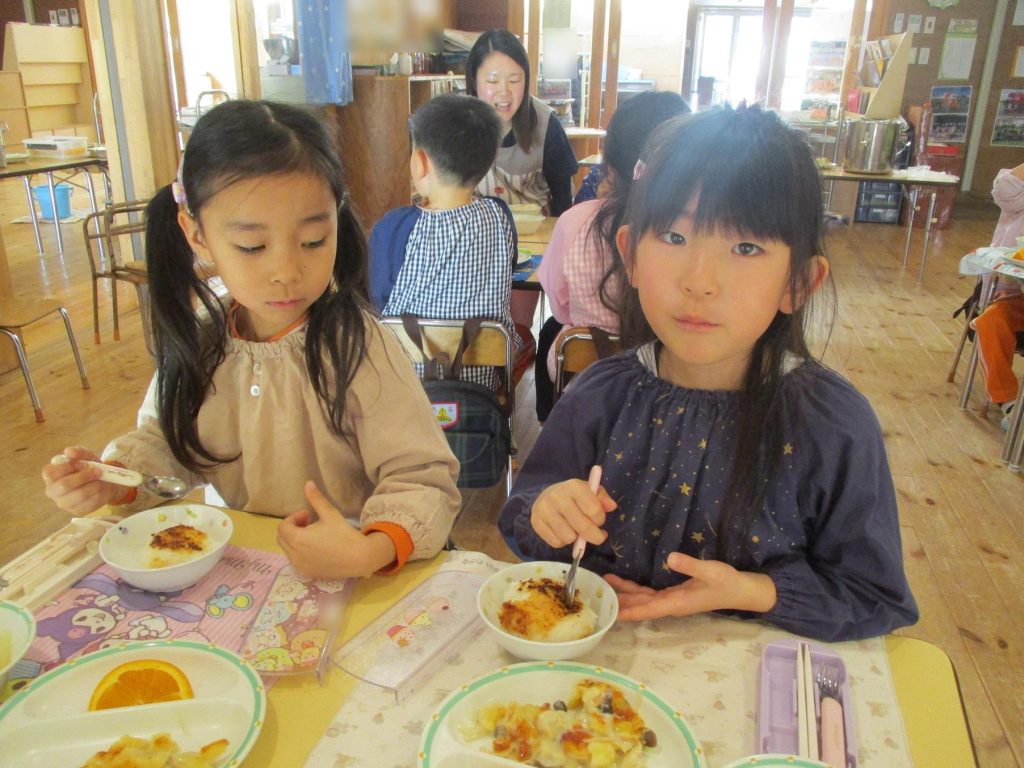 おいしそうに焼けたら、いざ実食!「いただきまーす!!」とさっそく大きなお口で食べていた子どもたちでした。