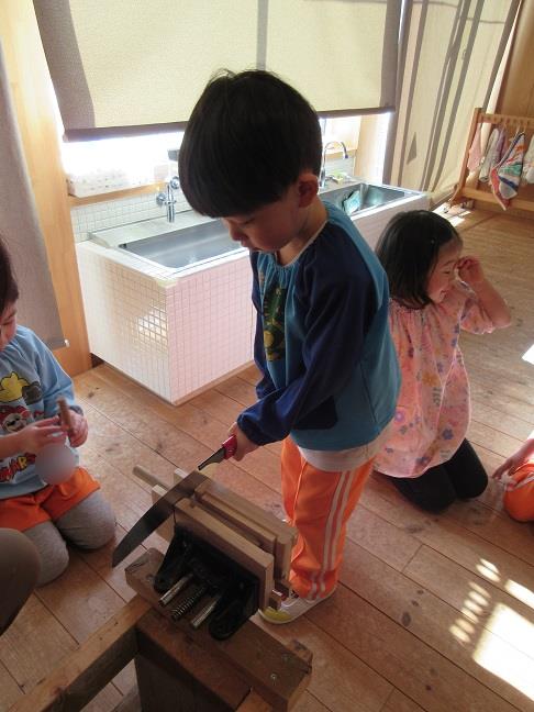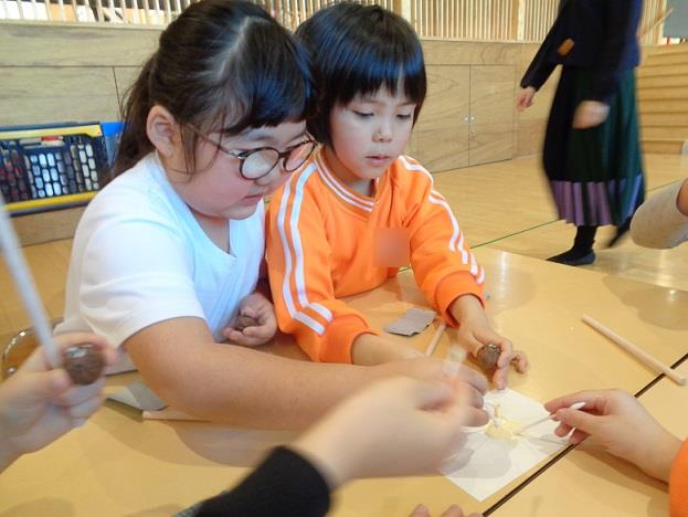 秋に子どもたちと一緒に探し集めたクルミを丸棒にさす作業を行いました😊