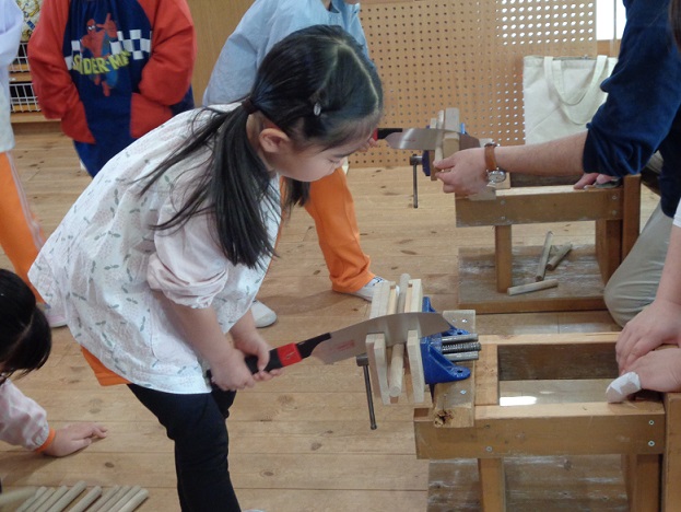 用意されていた板にボンドを付けて器具でしっかりと挟め固定する作業や、持ち手となる棒をノコギリで切る作業を行いました😊