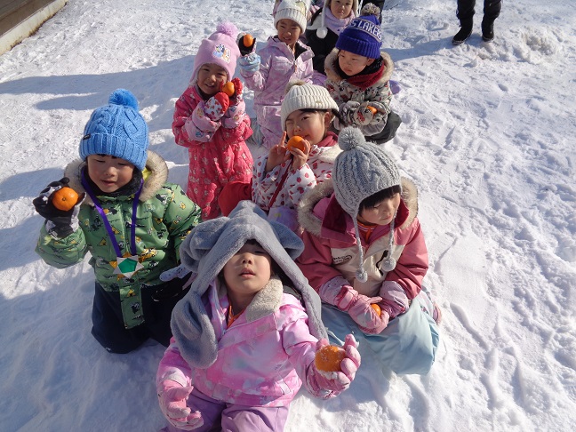 最後の競技は『旗取り』です!築山の上の、3本の旗を目指して雪の中を駆け上がりました🚩山の上には、みかんも隠れていましたよ🍊