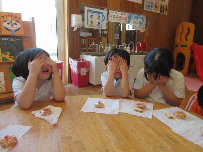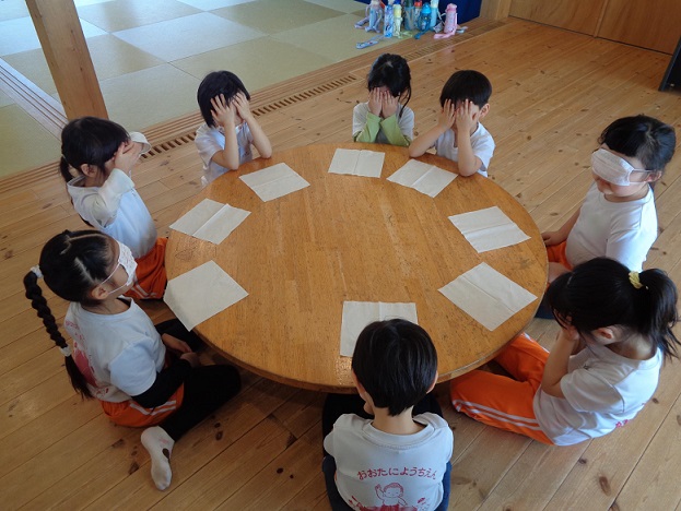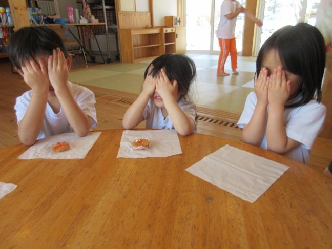 目をつぶって何がもらえるのワクワクしながら待っていた子ども達😁♡