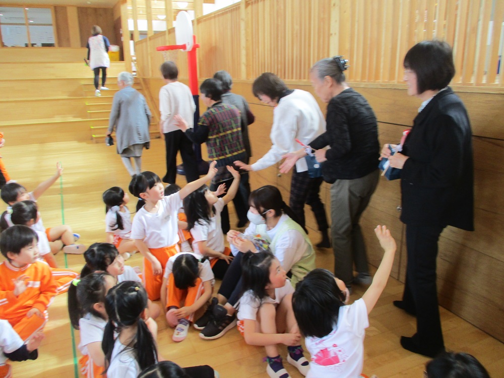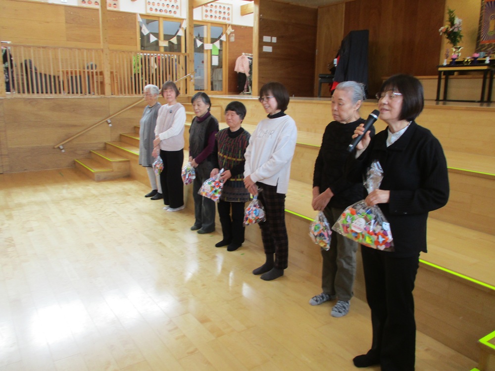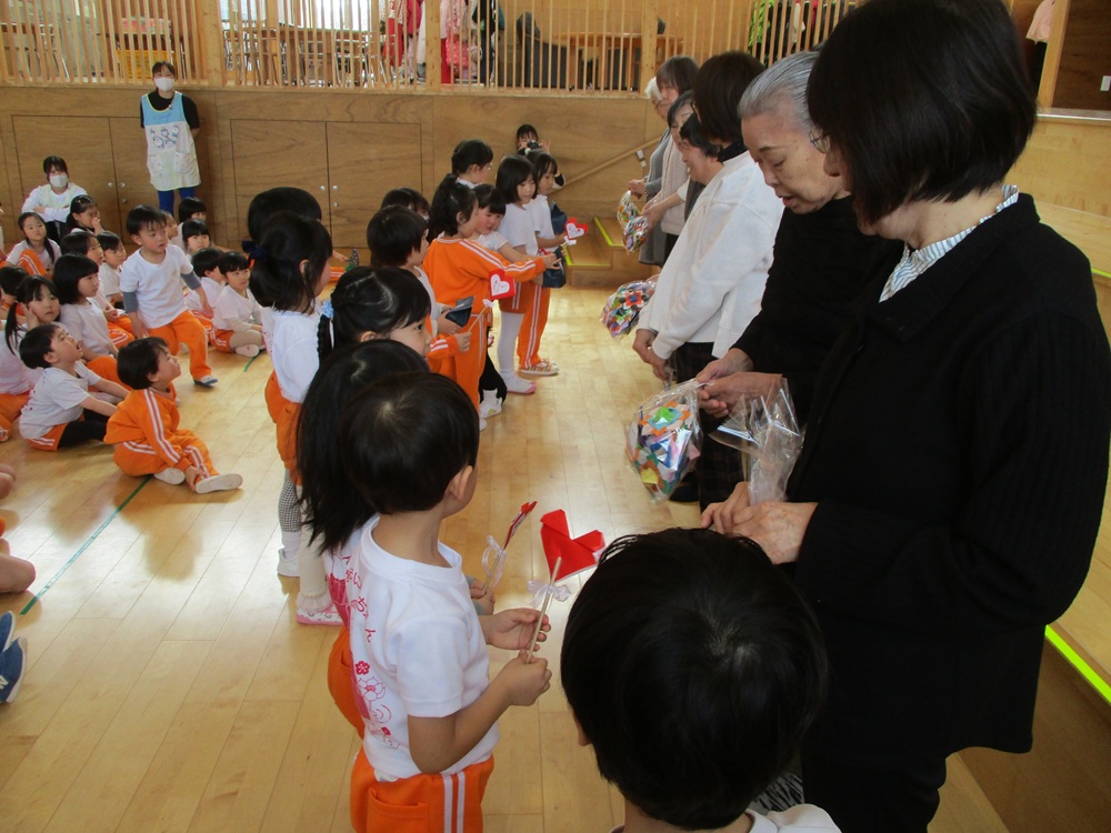 子どもたちからはありがとうの気持ちをこめてハートのお花を、ボランティアさんからは、折り紙で作ったコマをプレゼントしていただきました。