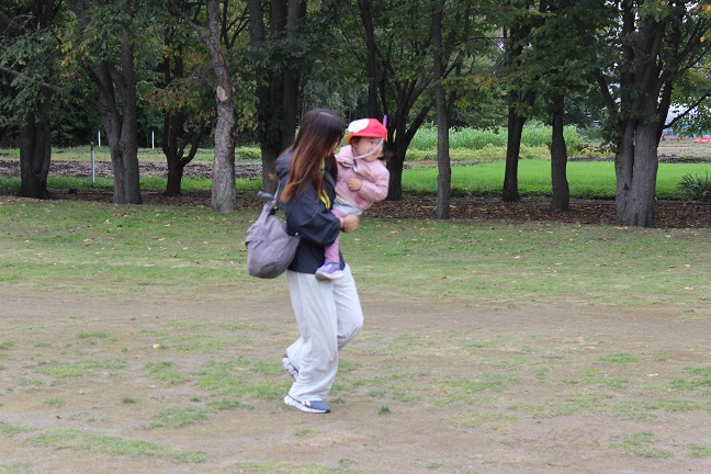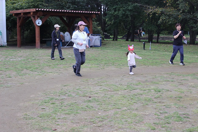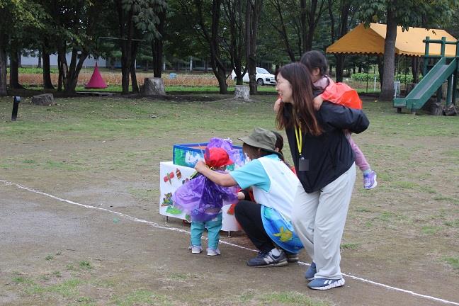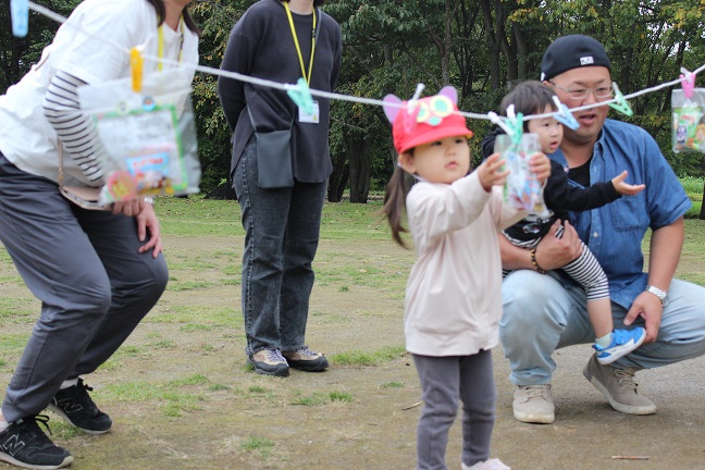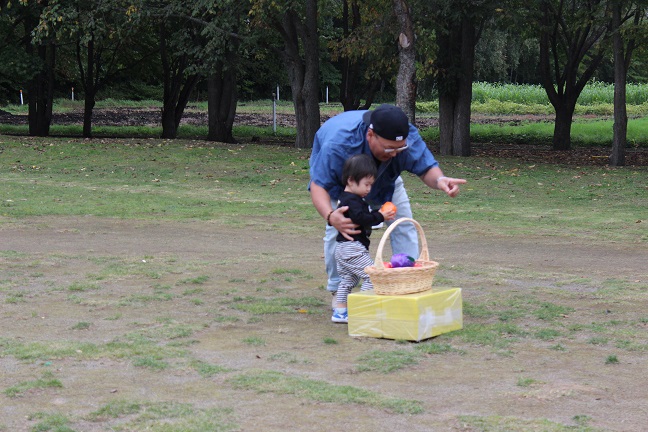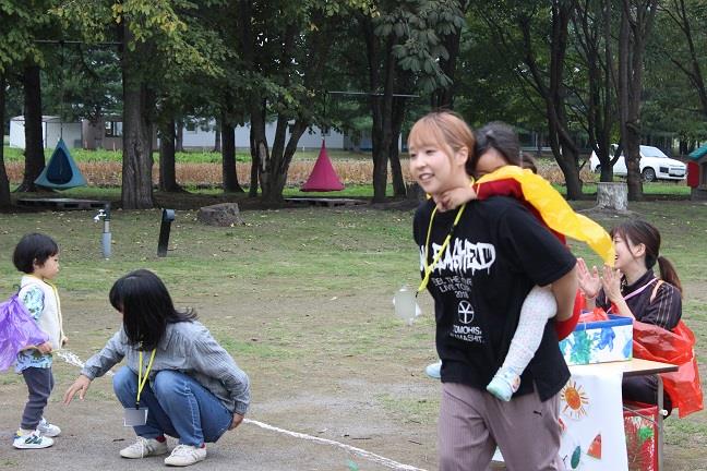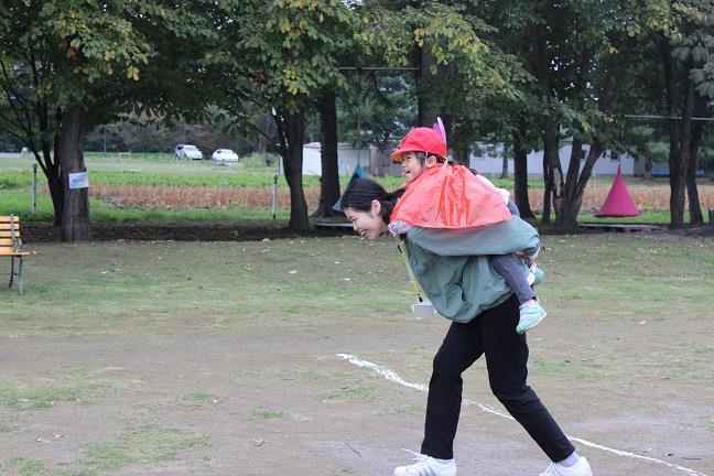 ちょうちょになったら、お父さんお母さんのおんぶでゴールに向かいます。