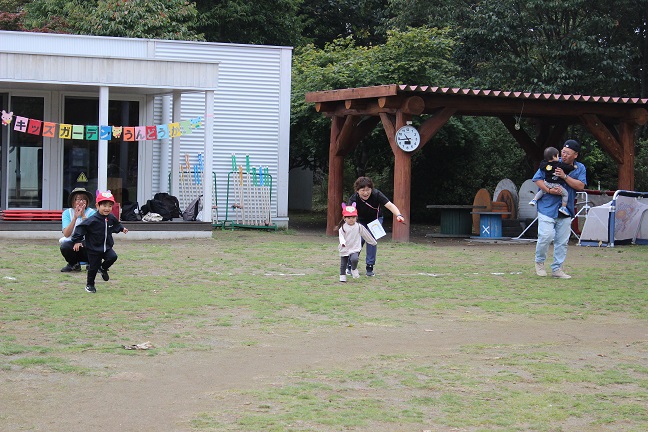 ゴールで待ってるお母さんに向かって一人で走るお友だちと、お父さんお母さんと一緒に走るお友だちがいましたよ。