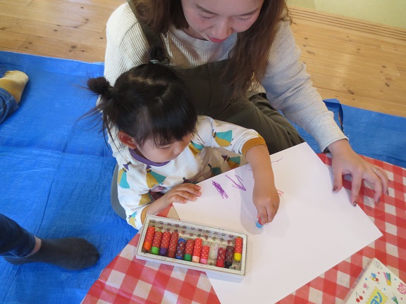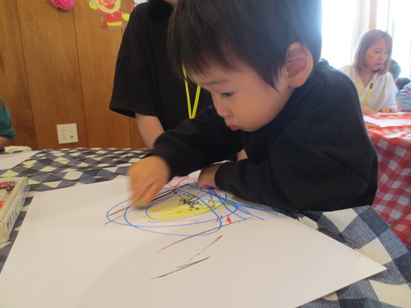 始めにクレヨンで絵を描いてから、上にえのぐを塗っていき、クレヨンがえのぐをはじいて絵が浮かび上がる様子に「わぁ!」と声が上がりましたよ。