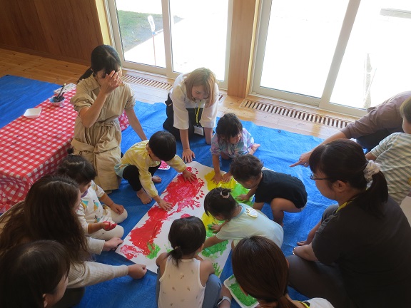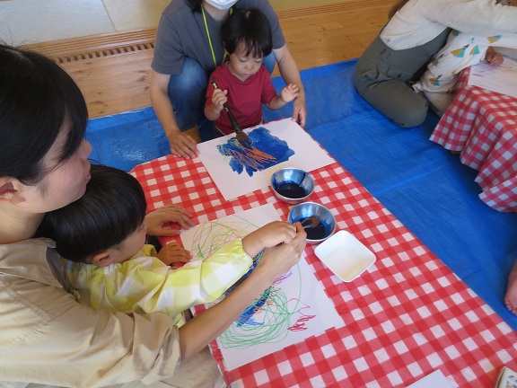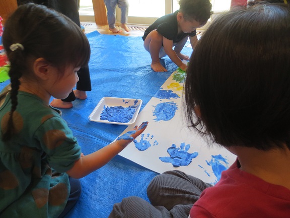 自分の作品を仕上げた後は、大きな紙に手でダイナミックにえのぐを塗っていきました。