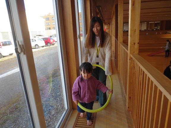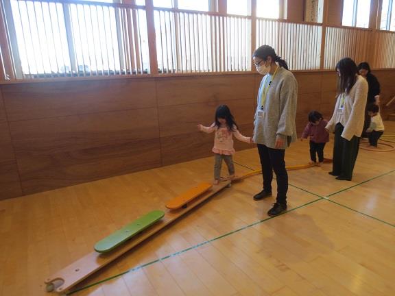 フラフープを使って両足ジャンプ、縄を使って一本橋を落ちないように歩きました。