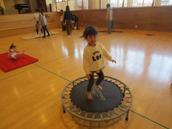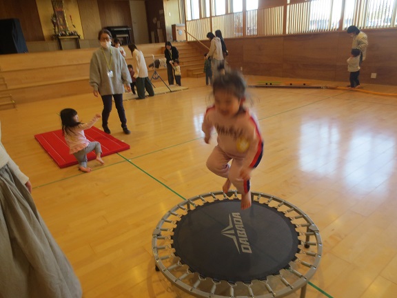 サーキット遊びでは、バランスボード、鉄棒(ぶら下がり)、マット(前転)、トランポリン、すべり台を順に行っていきましたよ。