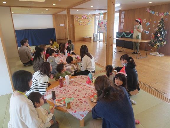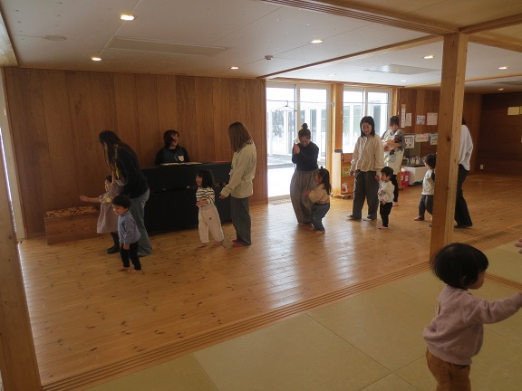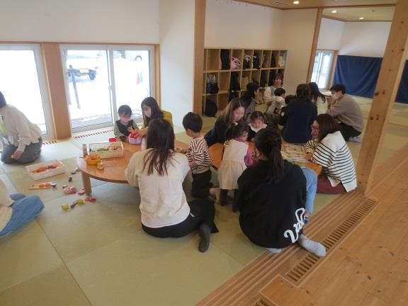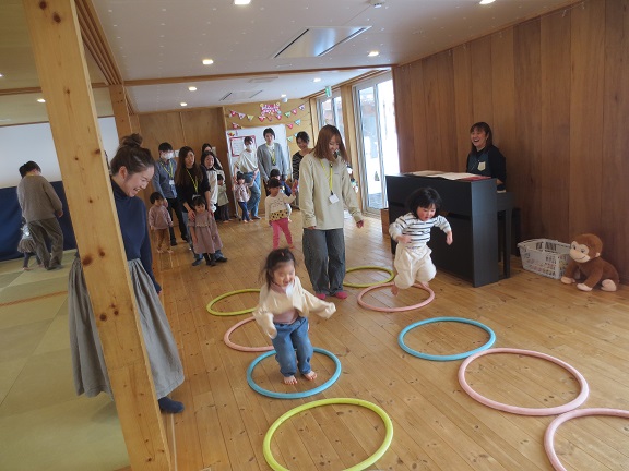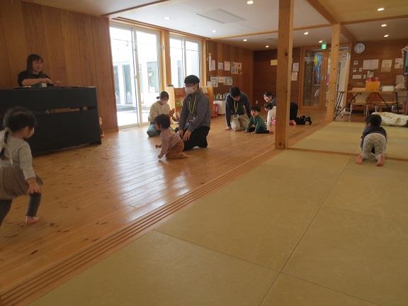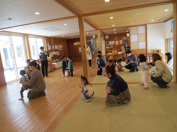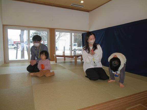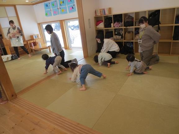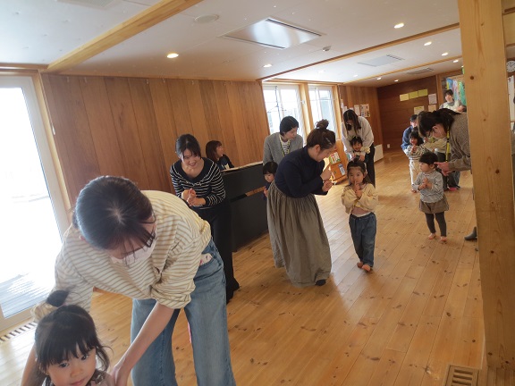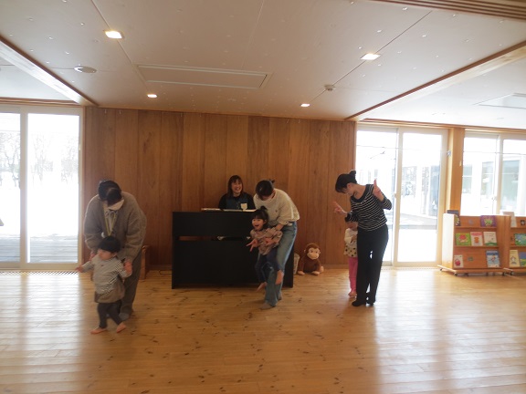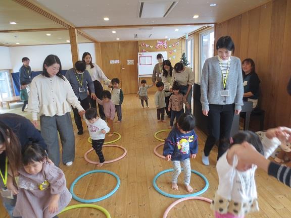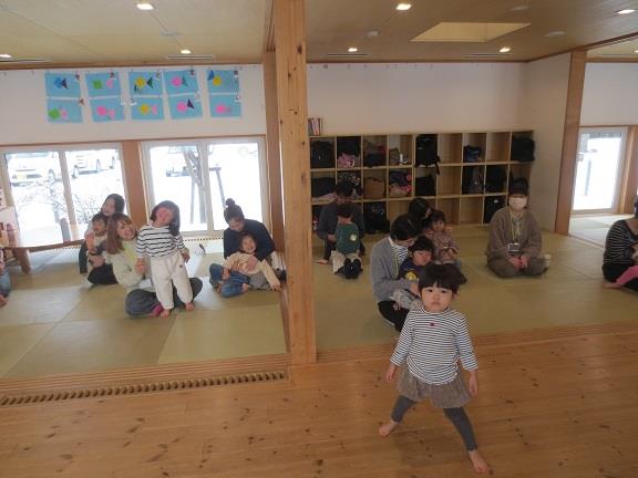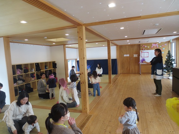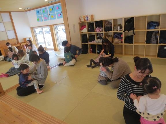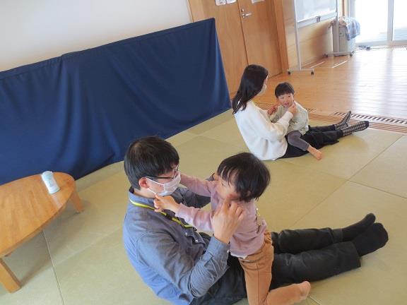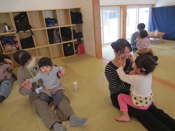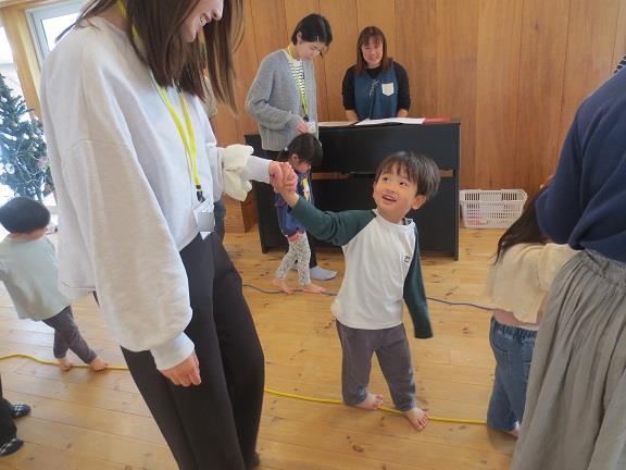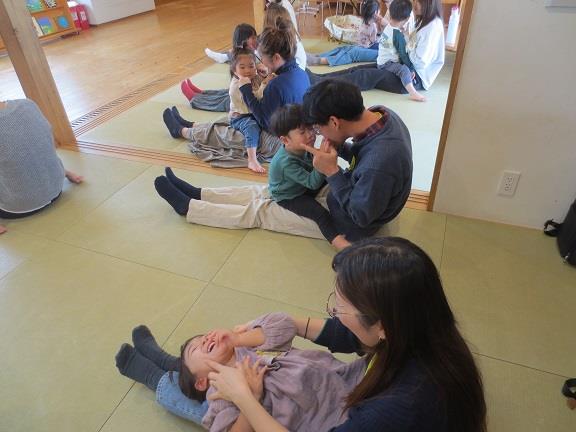 お母さん、お父さんのお膝に座って『一本橋こちょこちょ』をしたり、色んなテンポの『ジングルベル』の音楽に合わせてお互いのほっぺをツンツンしたり、スイングしたり…