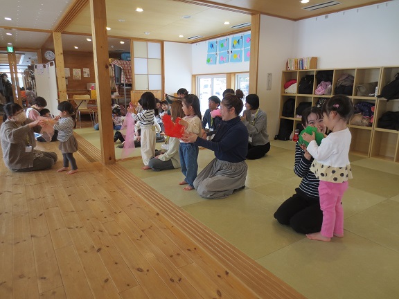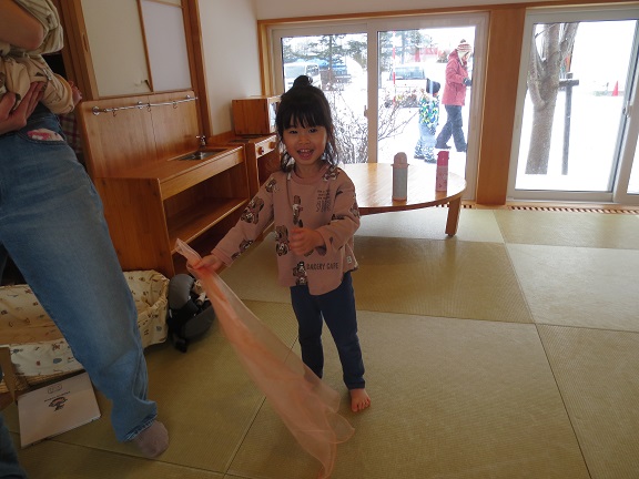 最後はシフォンスカーフで『にぎりぱっちり』をして、「ちいさな世界」の音楽に合わせて自由に踊って終わりました♪