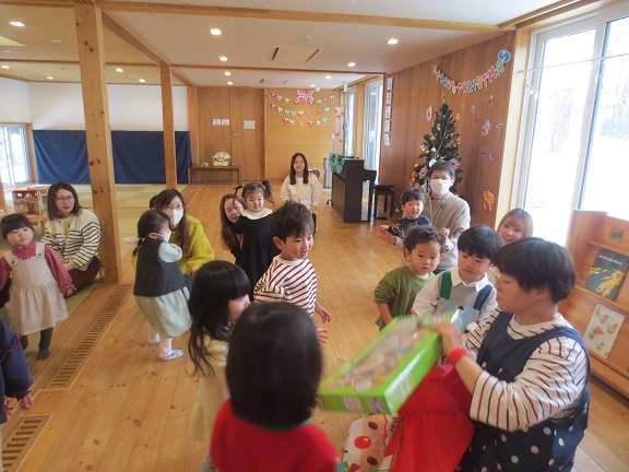 2学期最後の12月24日の朝の自由遊びの時間になんとサンタさんがプレゼントを持って来てくれました🎅