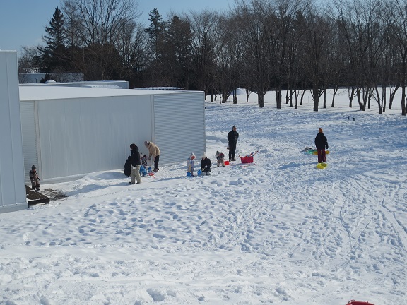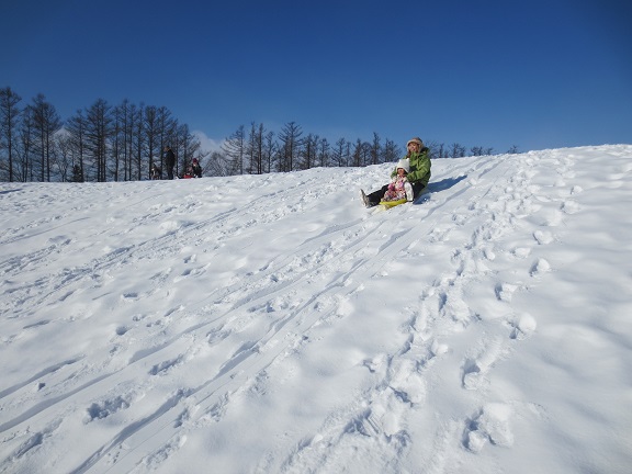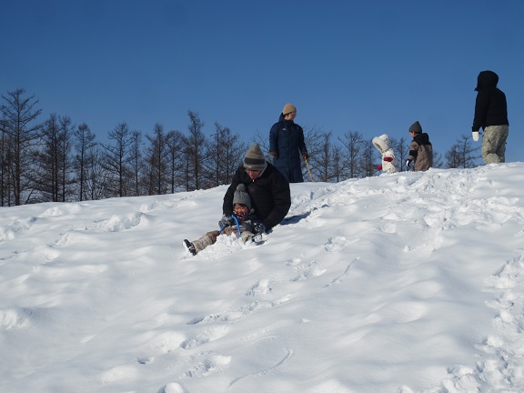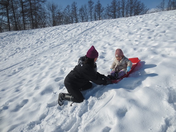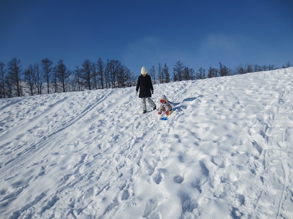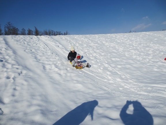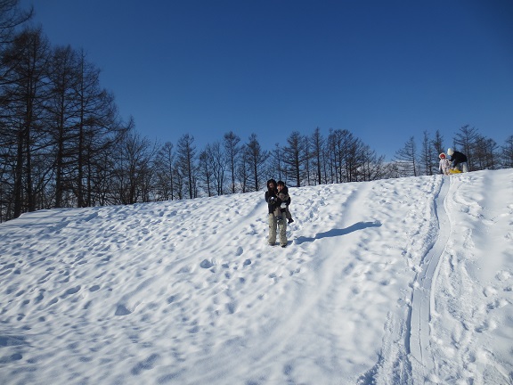 そりが初めてのお友だちは、山の途中から滑り始めて慣れてから上まで登ったり、上まで登ったけど下りられずに抱っこで下りてきたりもしていました。